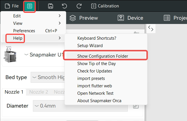 - Click the second icon at the top of the application to open the settings menu. Go to Help > Show configuration folder to open the folder location on your computer.