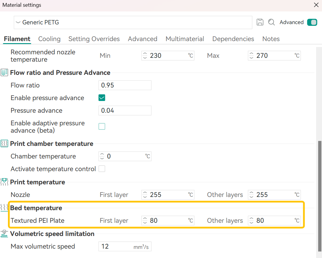 An issue where Generic PETG with a first-layer PEI steel sheet bed temperature set to 0 could cause poor first-layer print quality.