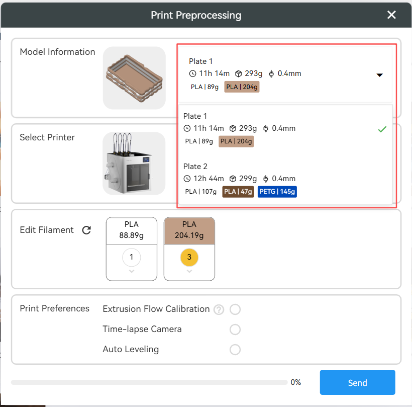 Print Now in the Model Library, a plate selection option is now available on the Print Preprocessing page.