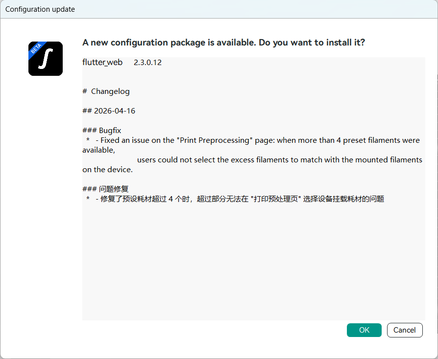 If the Configuration update dialog appears, click OK. After the configuration package is installed, restart the software to complete the update.
