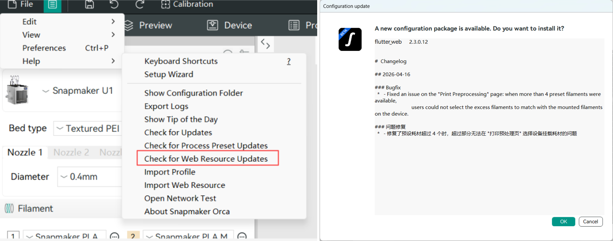 If the update prompt does not appear automatically after restarting, go to the top navigation bar and click Help > Check for Web Resource Updates. In the Configuration update dialog, click OK. After the configuration package is installed, restart the software to complete the update.