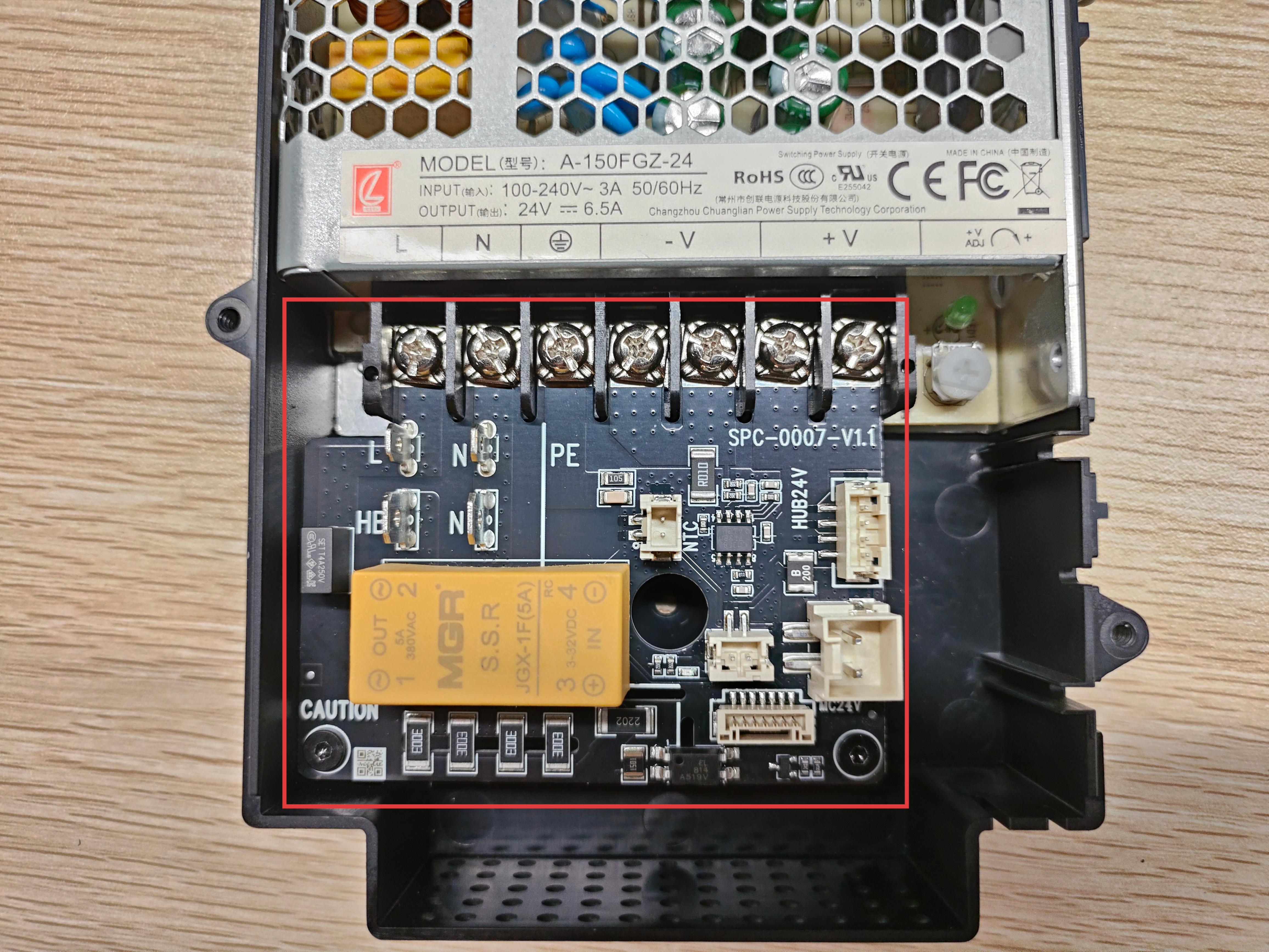 - Use the H2.0 hex key to remove the screws on the bottom of the AC heated bed control board, then remove the old AC heated bed control board.