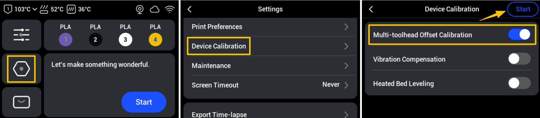 Device Calibration > SelectMulti-toolhead Offset Calibration > Start。