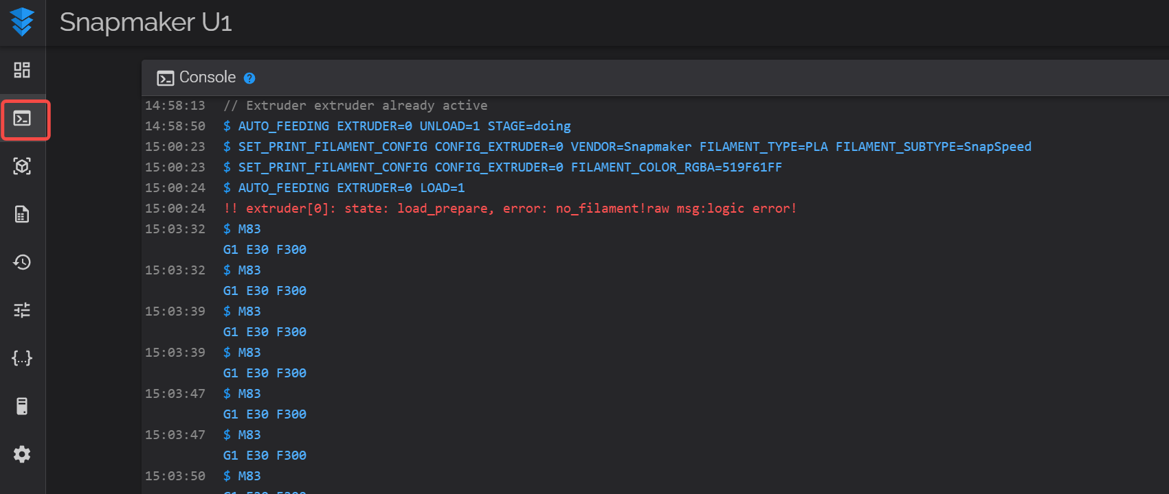 On the ‘Console’ page, you can view the machine’s error messages. If you encounter an issue that cannot be resolved, please copy the information from this page and provide it to the technical support team