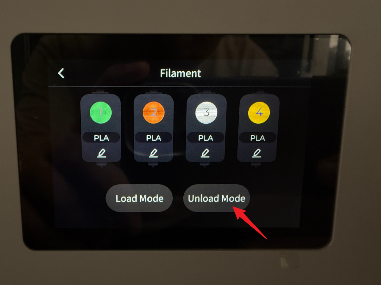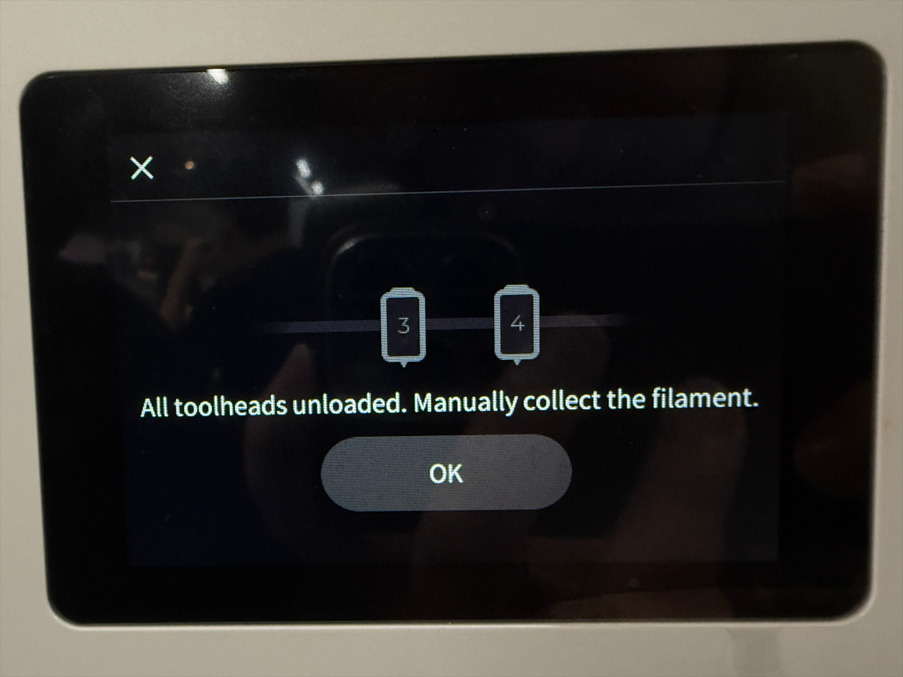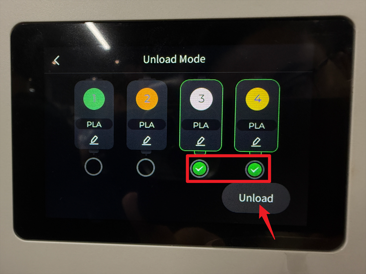 For replacing the right filament feeder: Select Toolheads 3 and 4, then tap "Unload".