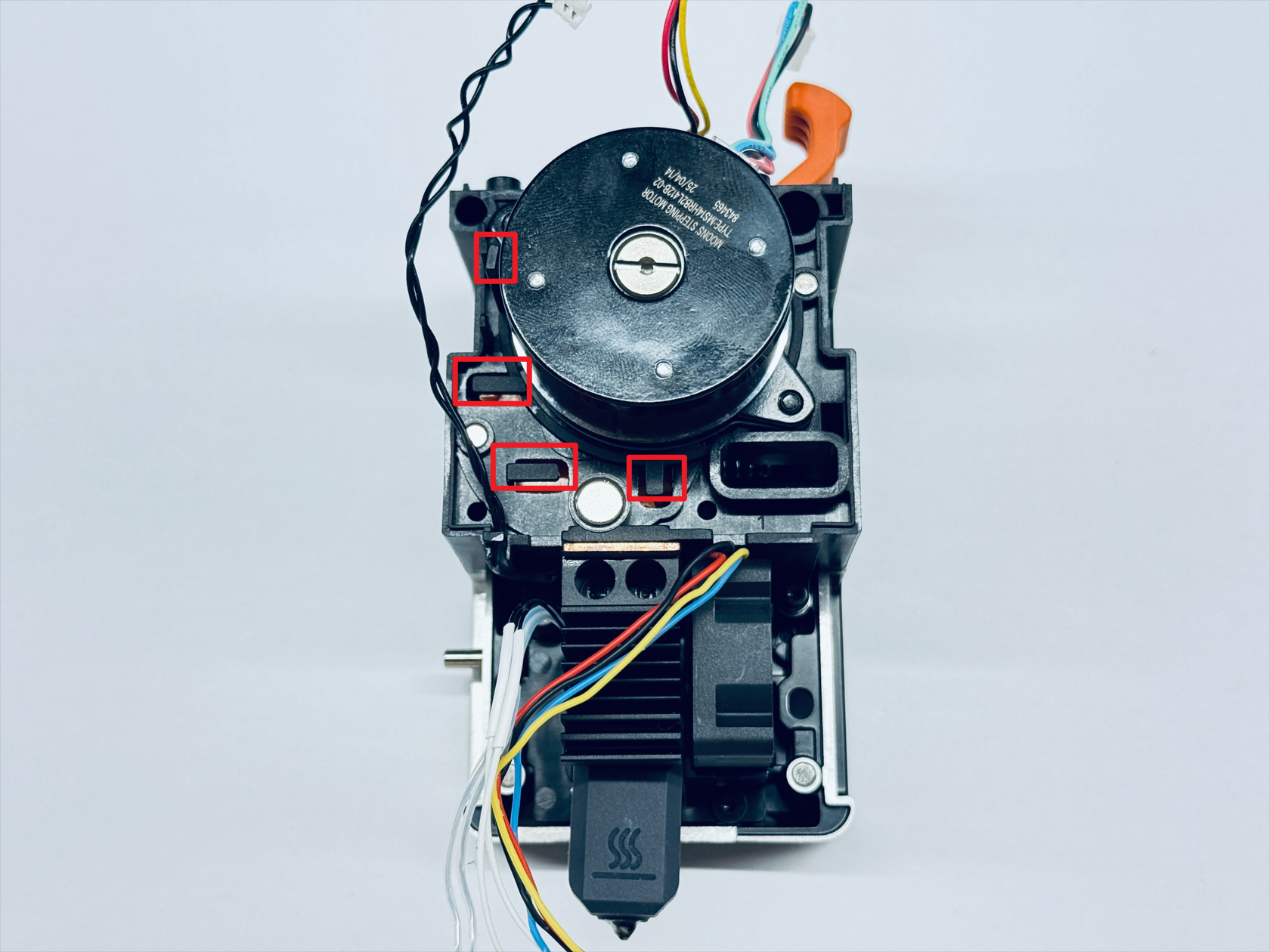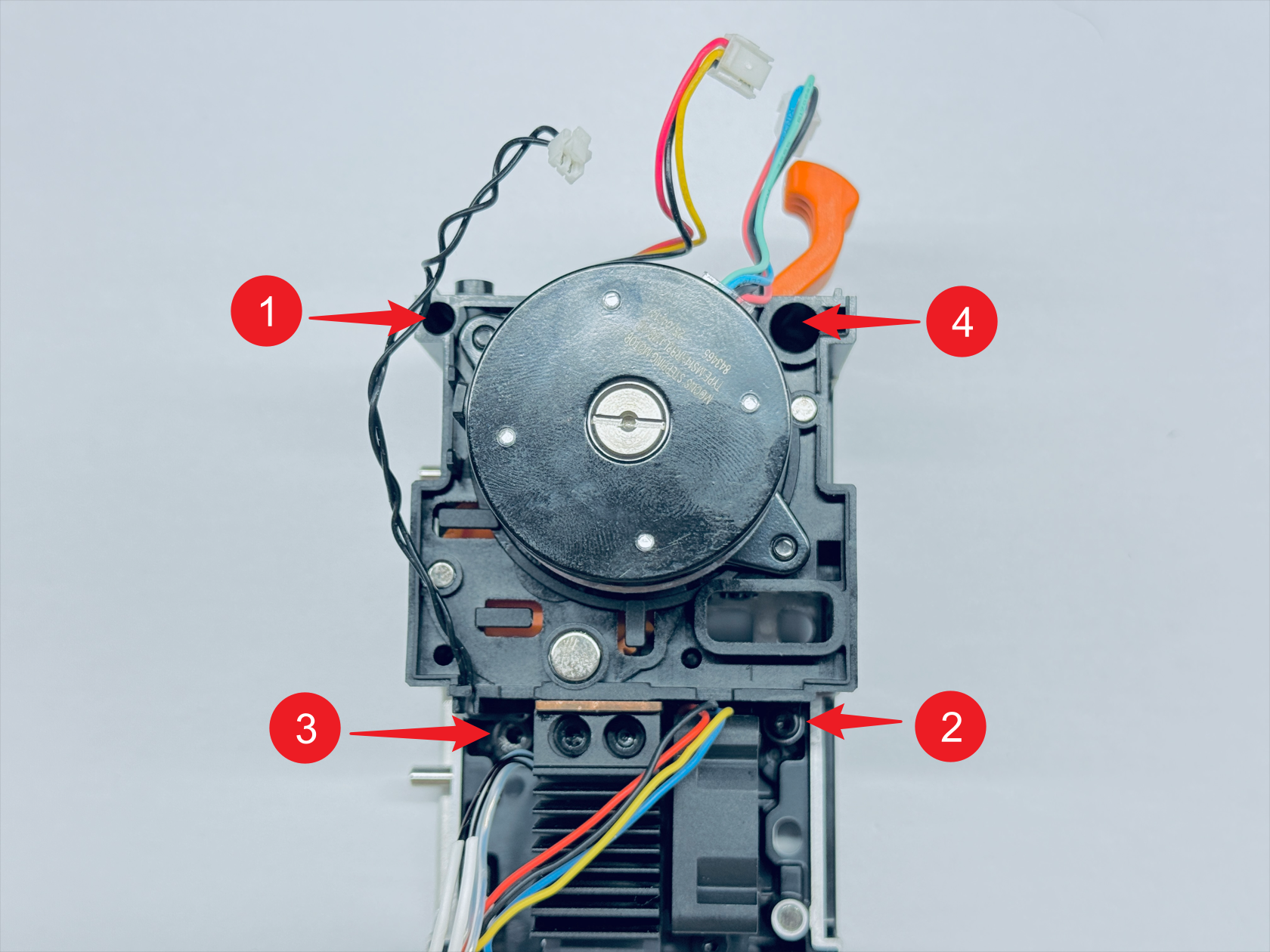- Use the H1.5 hex key to unscrew fixing screw 1 and screw 2, and use the H2.0 hex key to unscrew fixing screw 3 and screw 4, then remove the extruder unit.