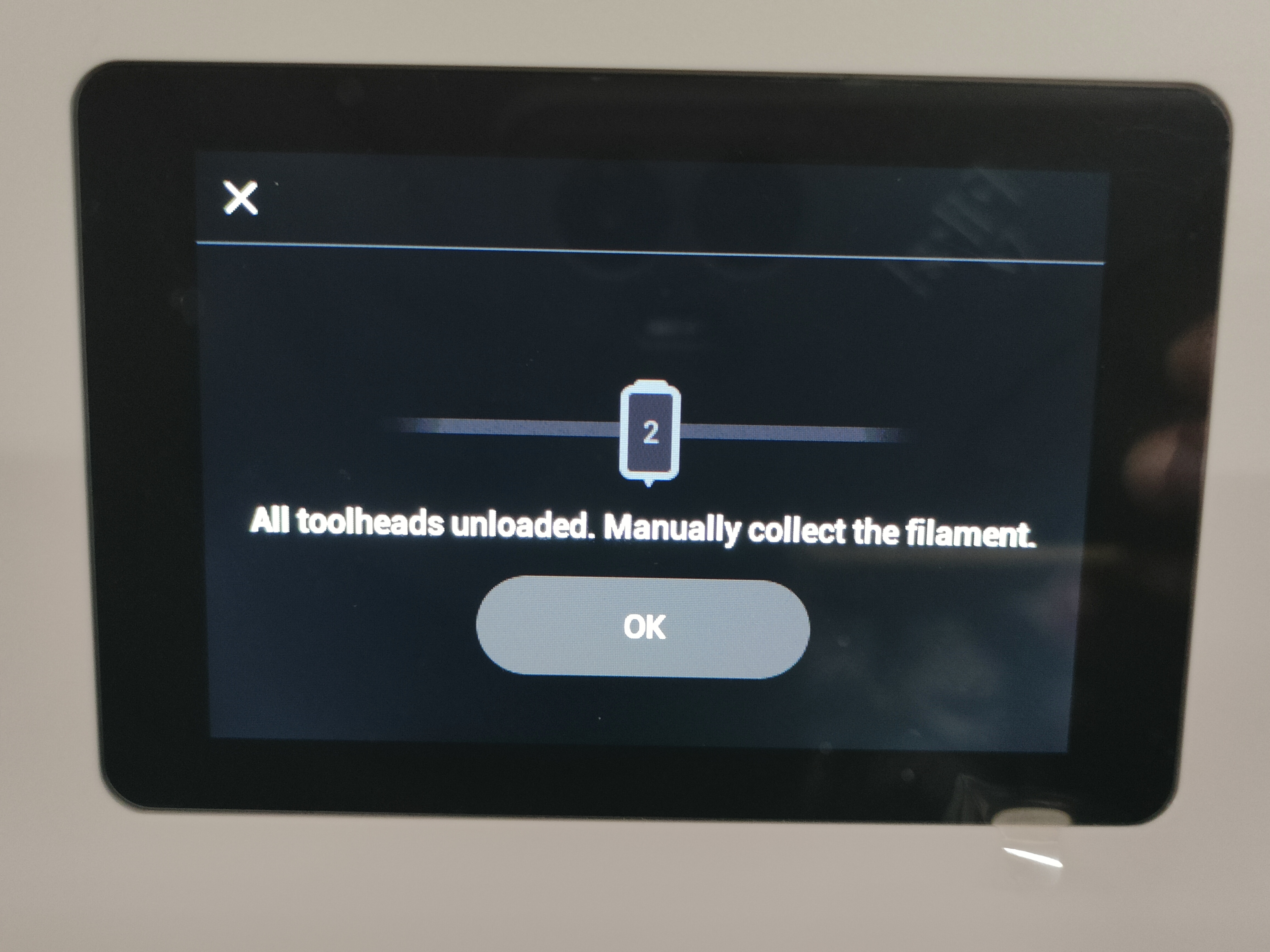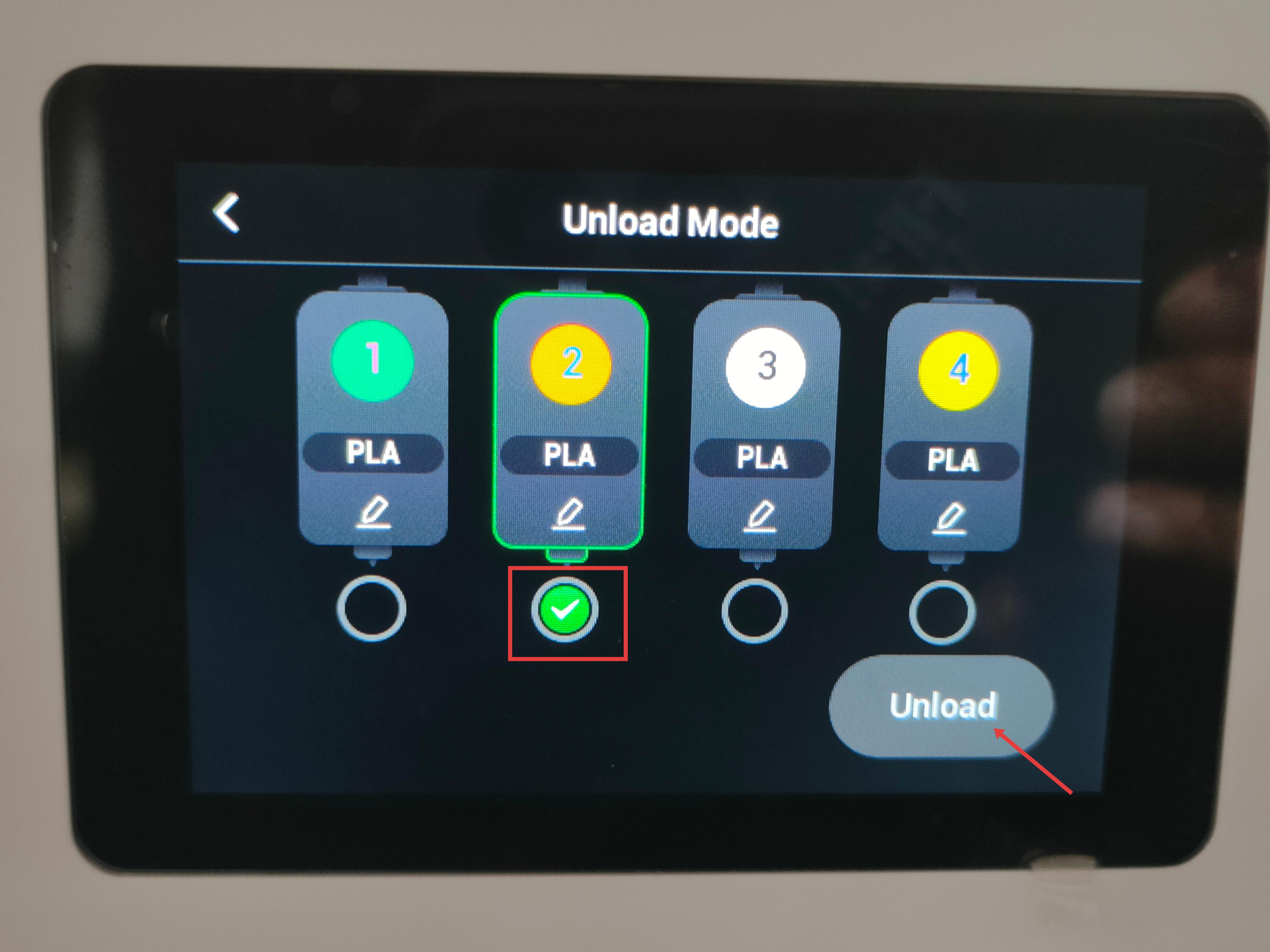 - Select the target toolhead (e.g., No.2) and tap "Unload".