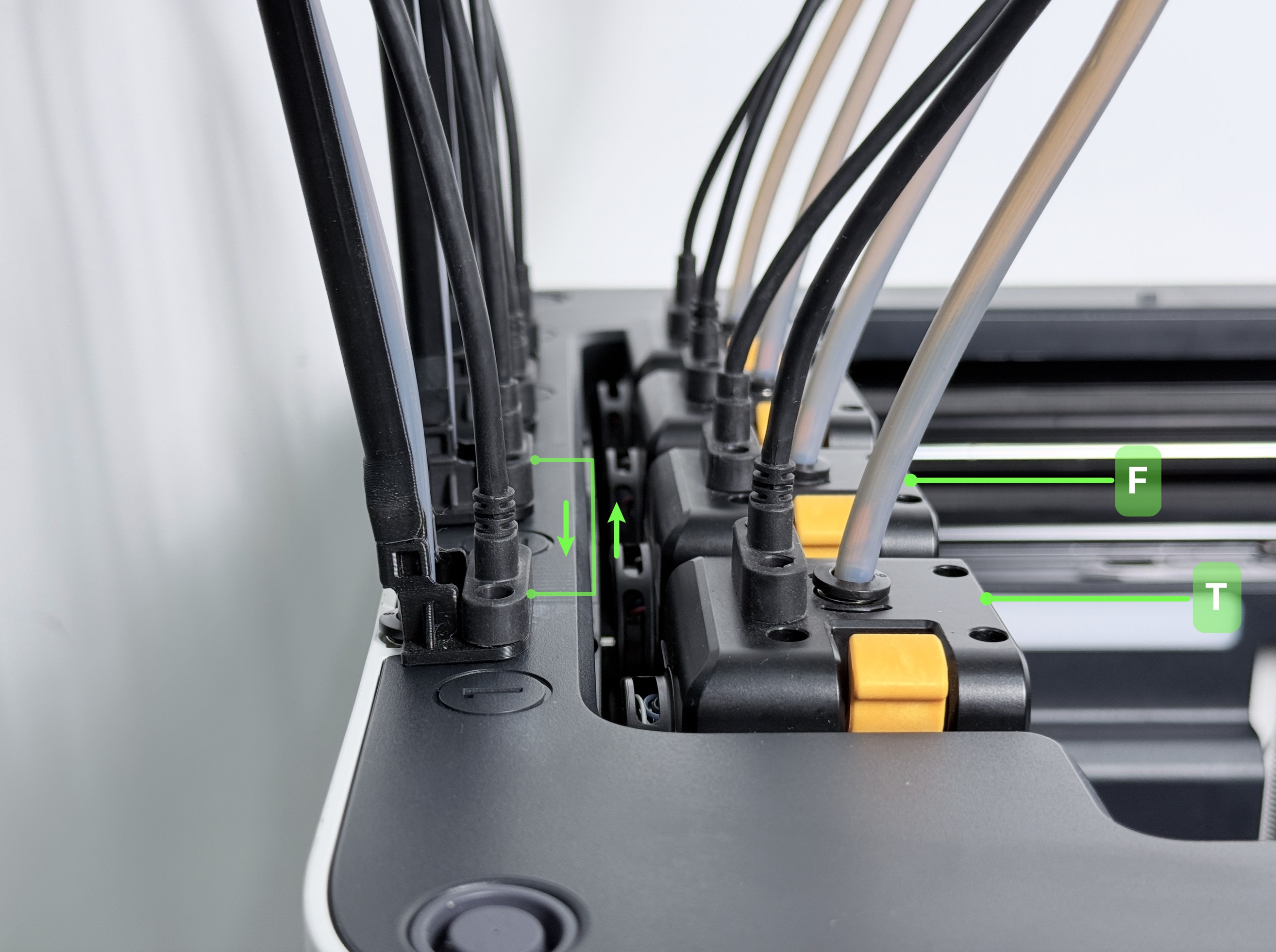 When only the machine-side ports are swapped, the machine will recognize Toolhead T as Toolhead F, and vice versa.