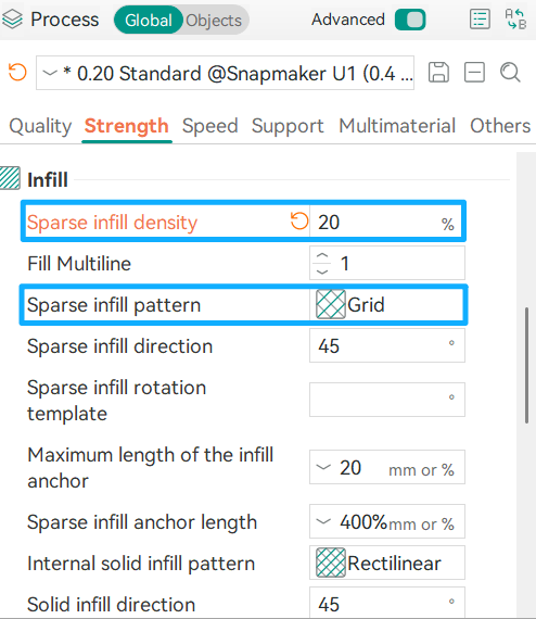 Even with the same infill density, different patterns can affect strength, flexibility, and printing speed. Snapmaker Orca currently offers 26 sparse infill patterns. While the optimal pattern depends on the print job, some patterns are particularly effective for addressing the gap issue discussed here.
