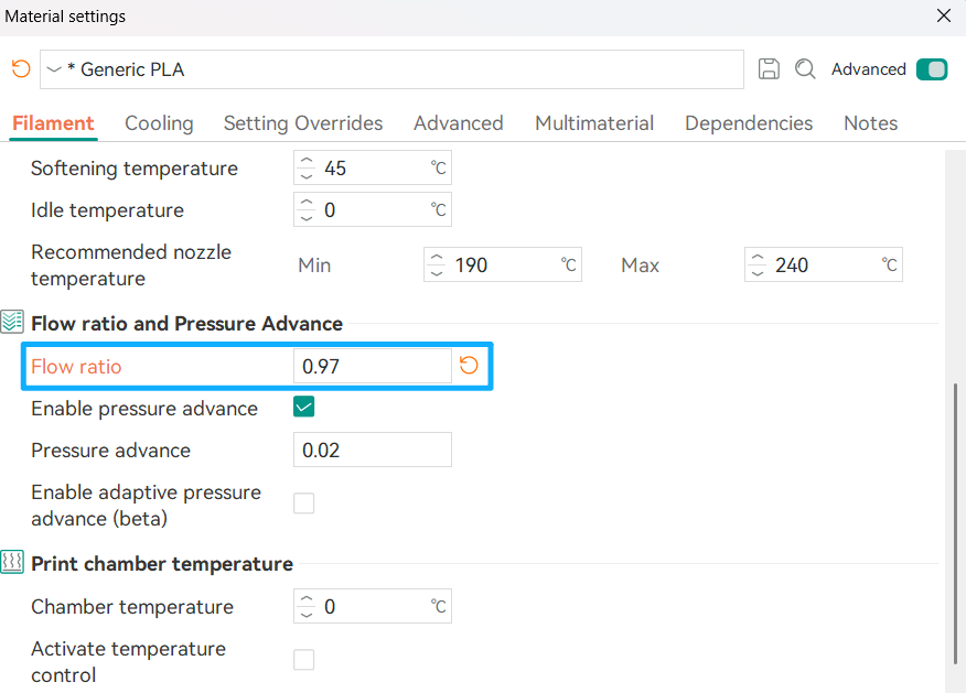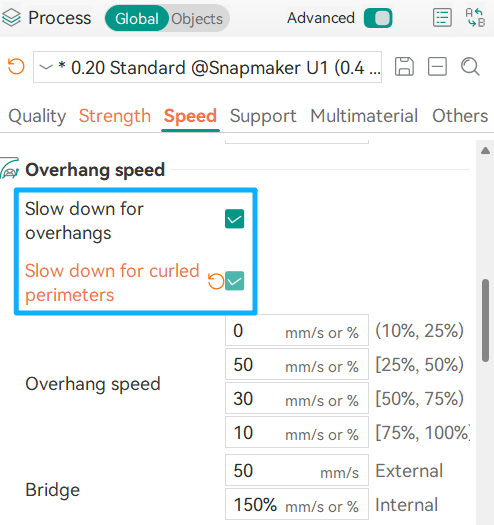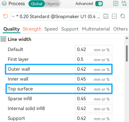 It is typically set to 105%–120% of the nozzle diameter. Taking the U1 standard 0.4mm nozzle as an example, the recommended range for the outer wall line width is 0.42-0.48mm. Increasing the value slightly within this range can help overhangs achieve a smoother surface.
