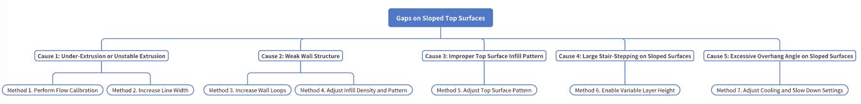 Gaps on sloped top surfaces are typically caused by a combination of insufficient top-layer extrusion, weak wall structure, and the inherent stair-stepping effect of inclined surfaces.