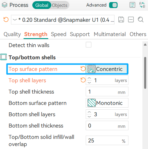The top surface line width affects the print quality of the top layers and is generally set to 100%–105% of the nozzle diameter. Taking the U1 standard 0.4mm nozzle as an example, the recommended range for the top surface line width is 0.4-0.42mm. Adjusting within this range helps achieve a smooth finish without causing over-extrusion.