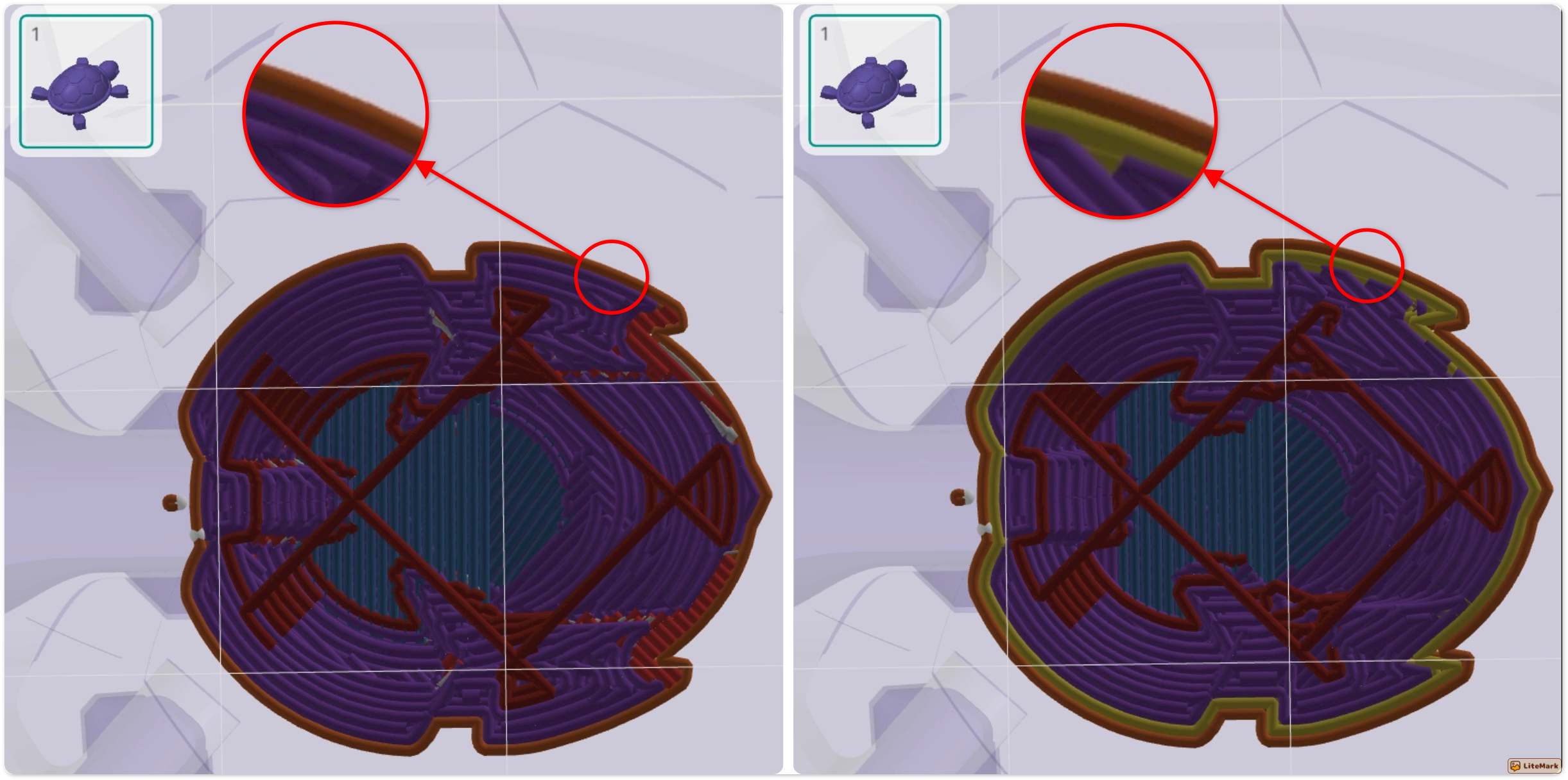 The image below illustrates the difference in the top structure when the wall loop count is set to 1 versus 2: