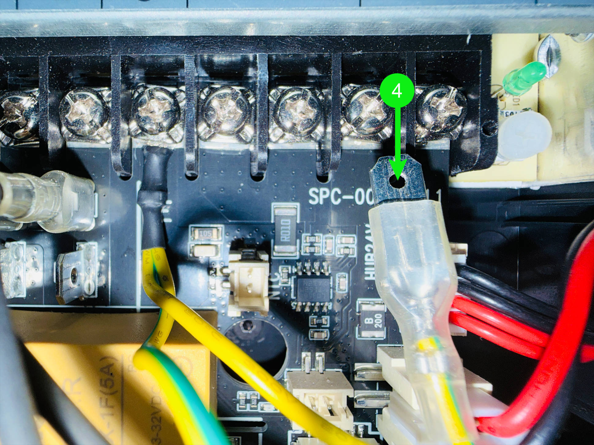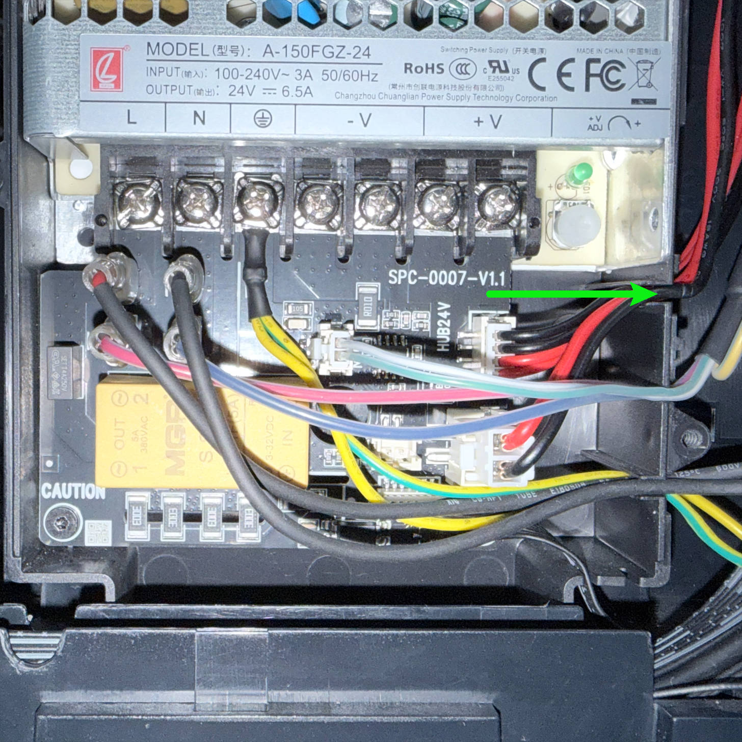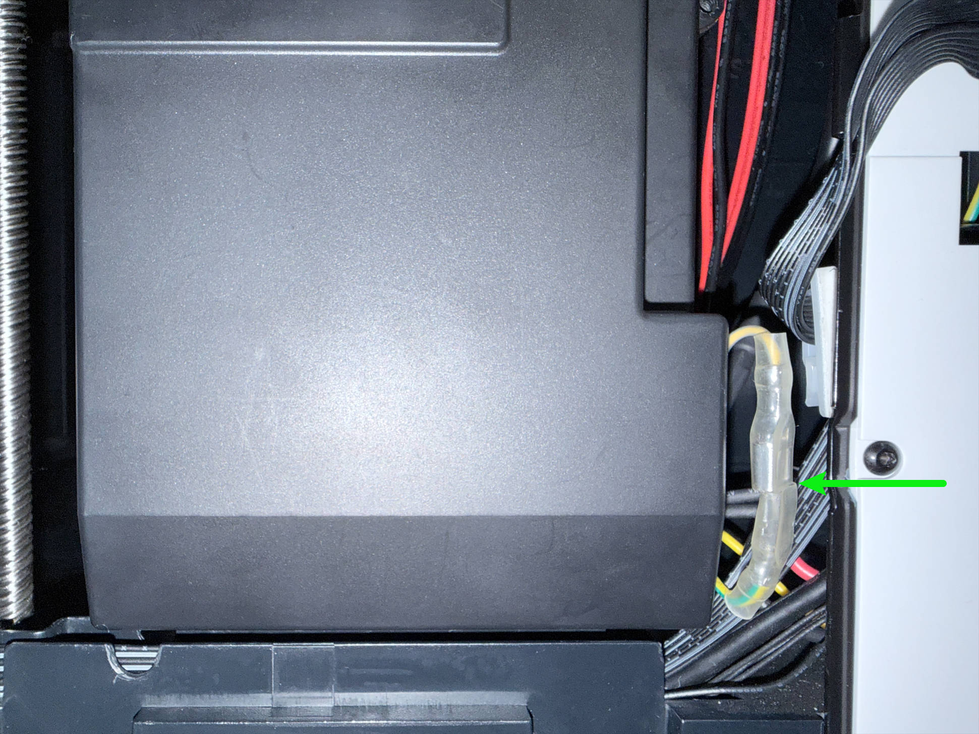 (5) Route the heated bed cable around the back of the power supply and above the screw post shown in the image, then pull it to the bottom-right corner.