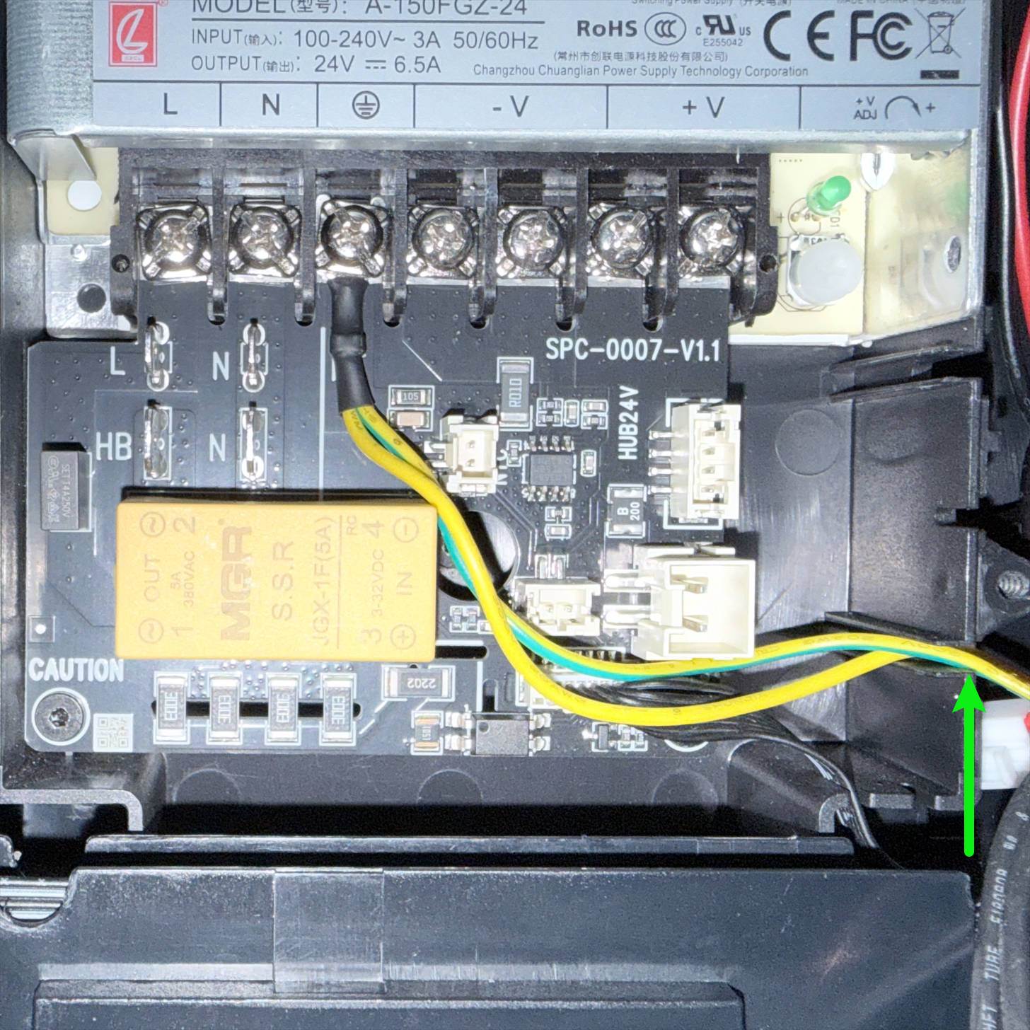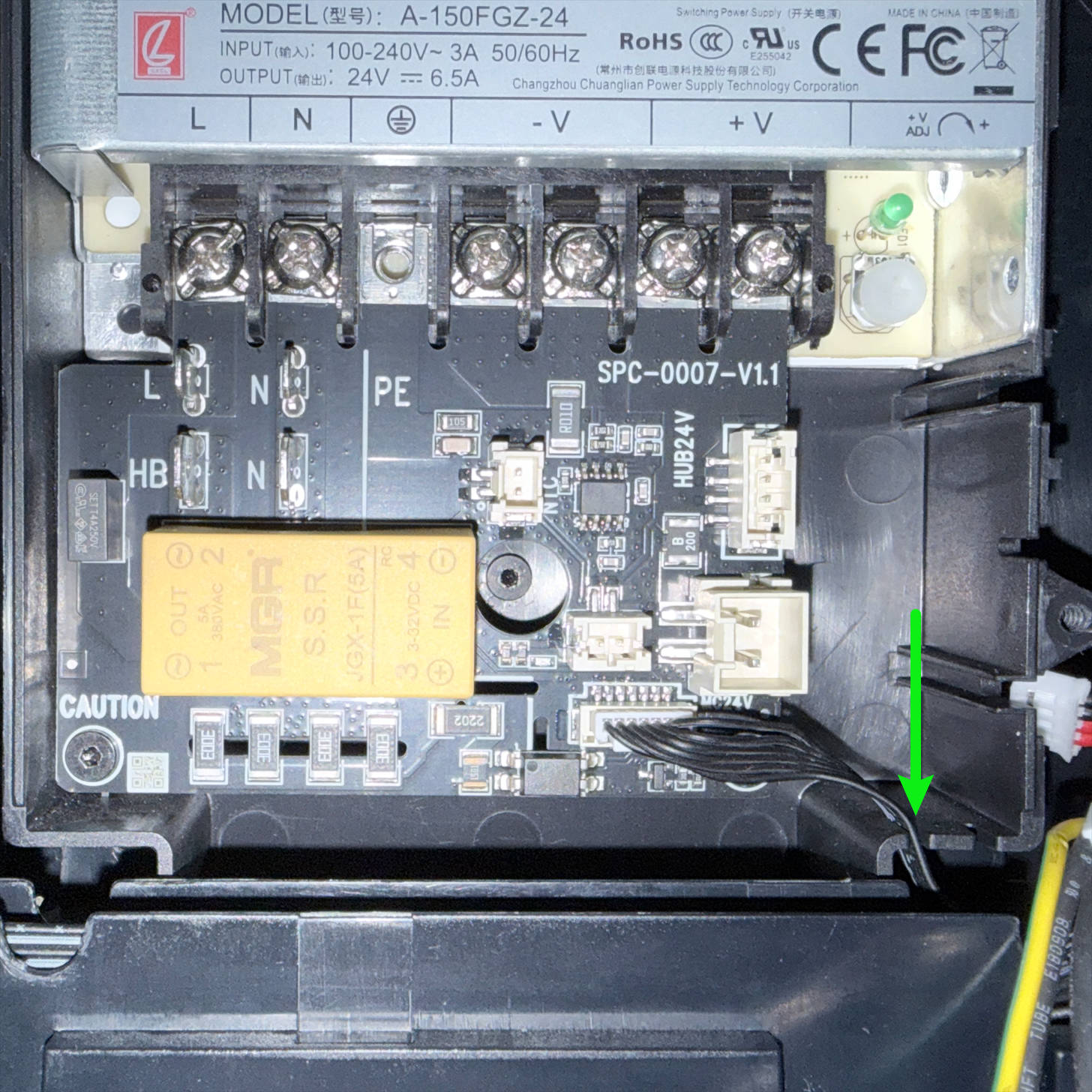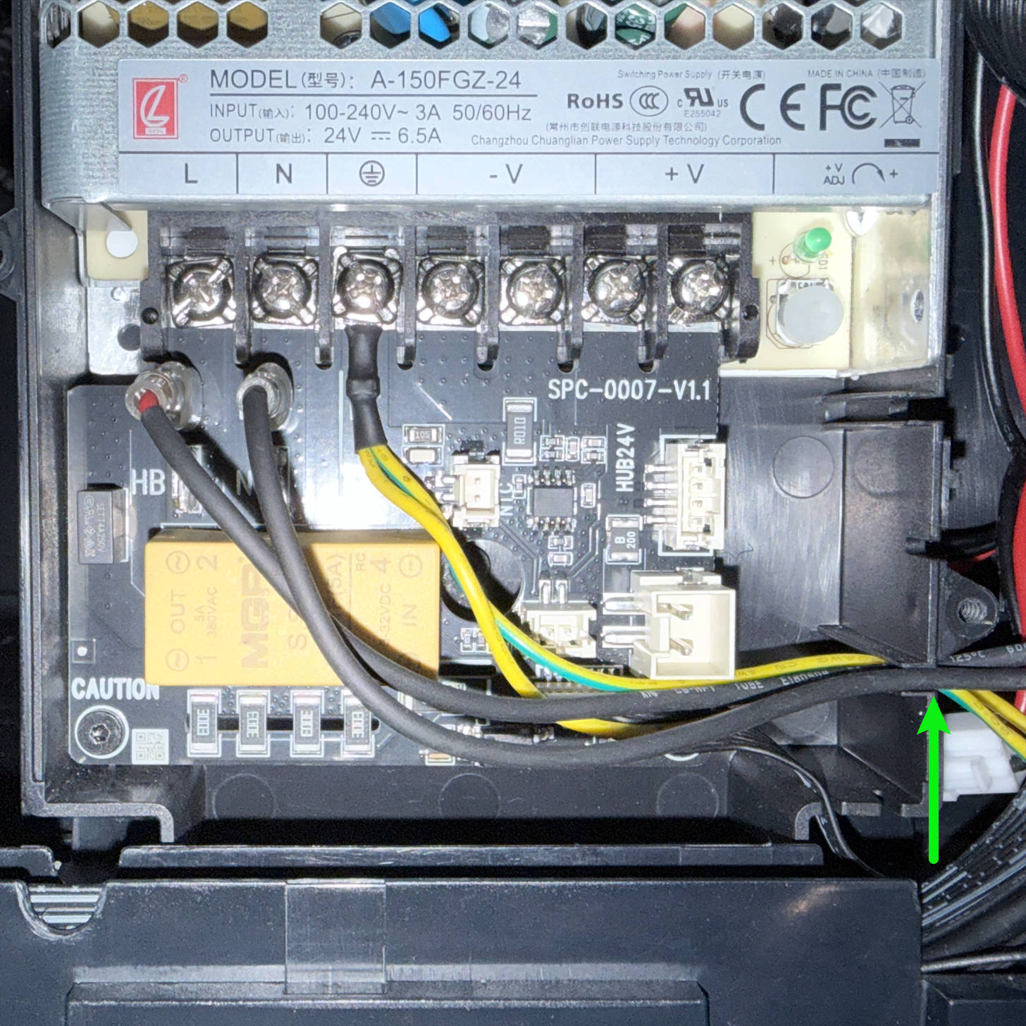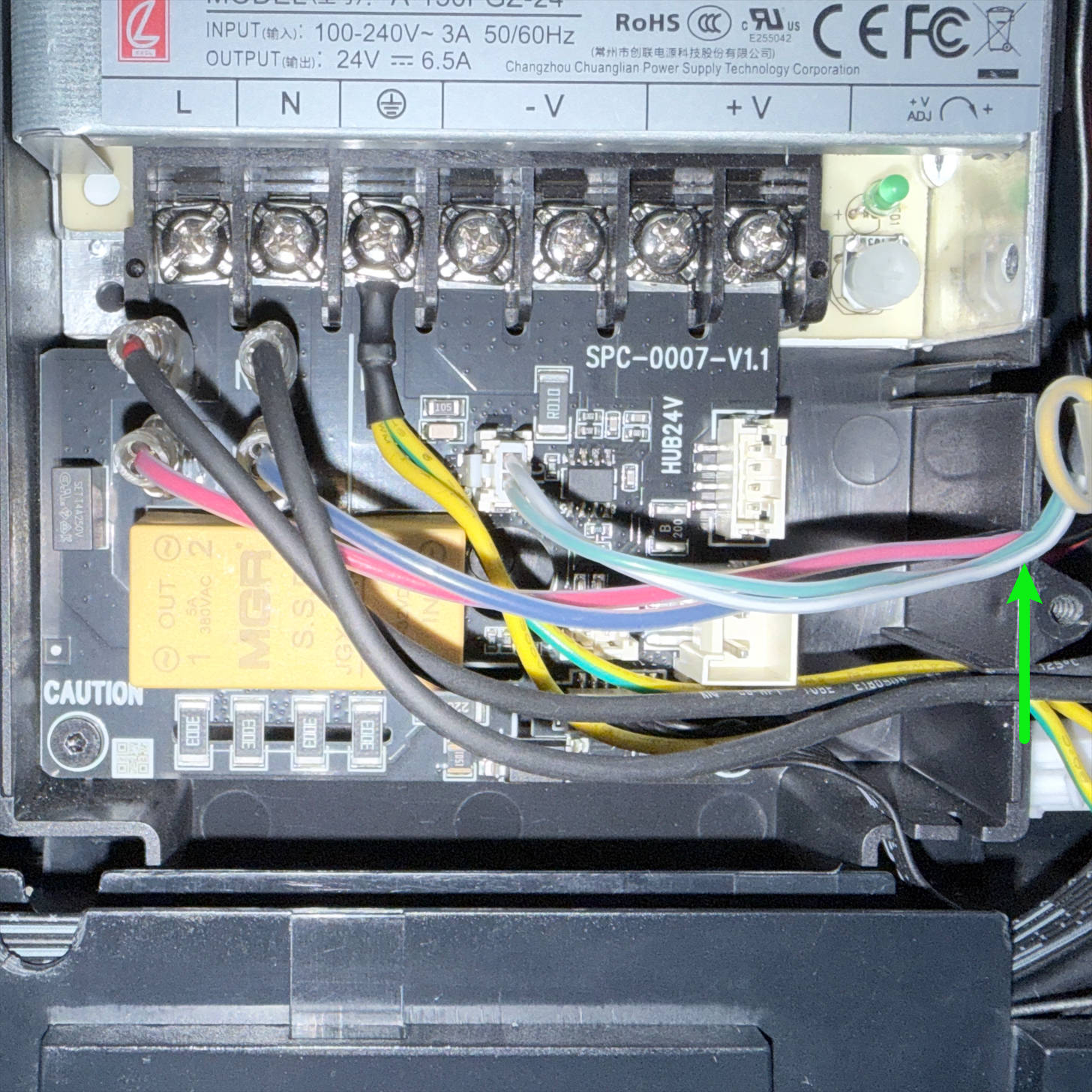 (5) Route the heated bed cable around the back of the power supply and above the screw post shown in the image, then pull it to the bottom-right corner.
