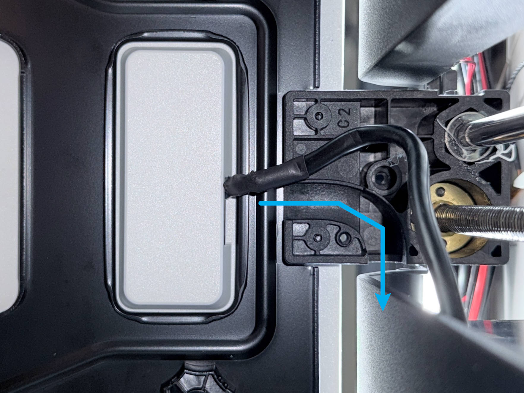 (2) Pull the timing belt at the bottom of the machine to raise or lower the heated bed, and check whether the heated bed cable is twisted (see example below). If so, loosen the screws from the previous step and reroute the cable.
