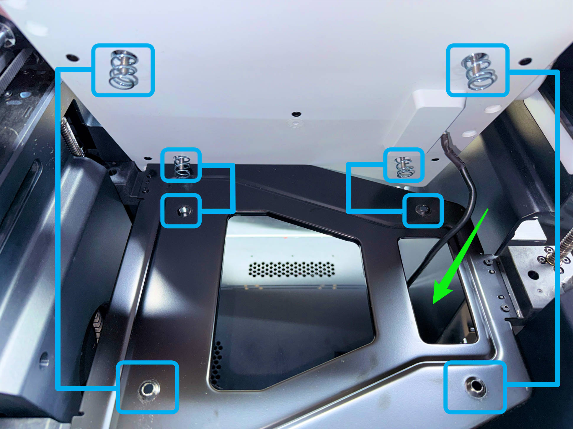 (1) Install the PEI steel sheet onto the new heated bed. Align the springs at the bottom of the heated bed with the raised holes on the sheet metal, and route the heated bed cable through the sheet metal following the path shown in the image.