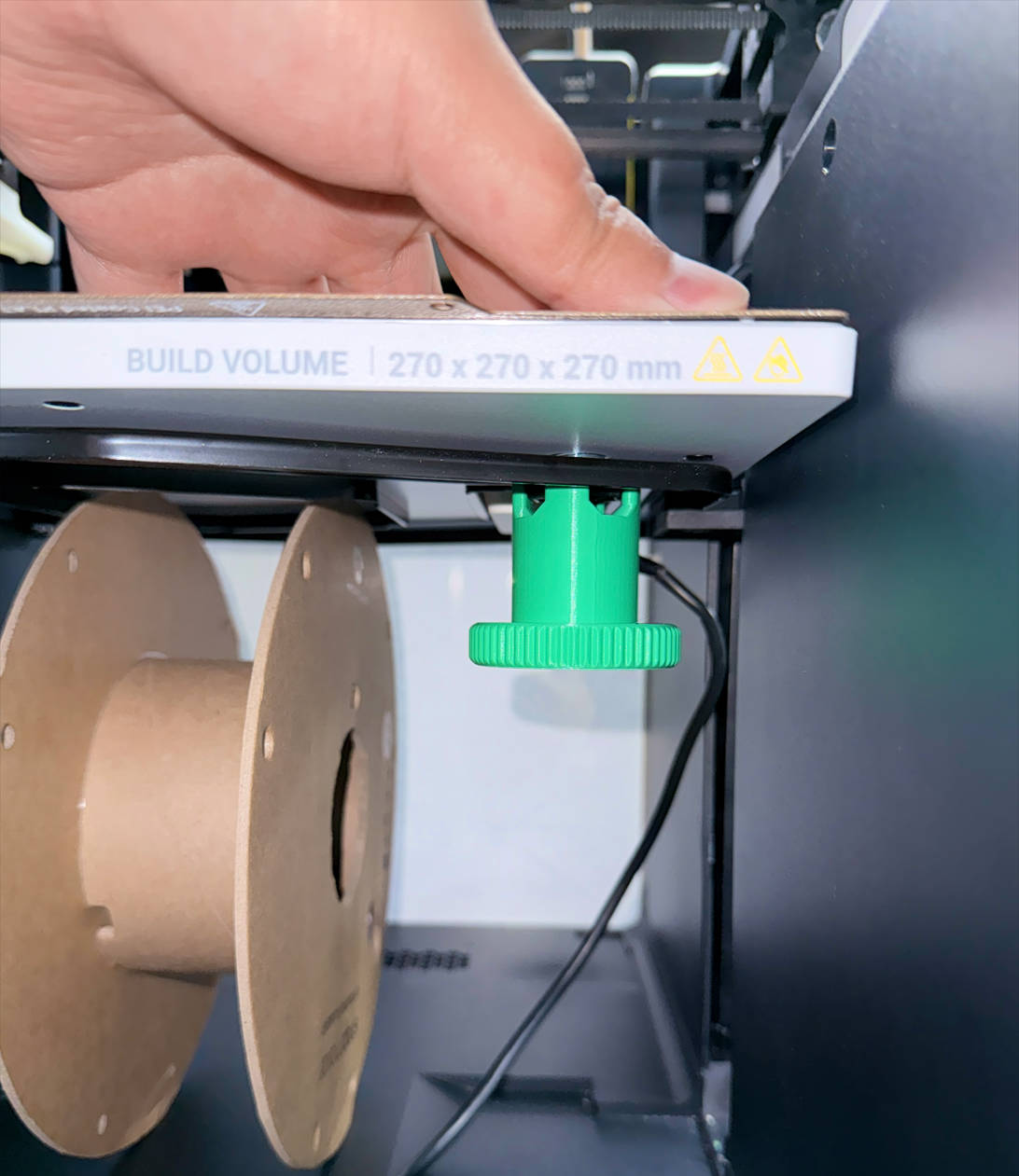 (2) Place a filament spool underneath. Press down on the corner of the heated bed so the screws at the bottom pass through the sheet metal, then tighten the nuts.
