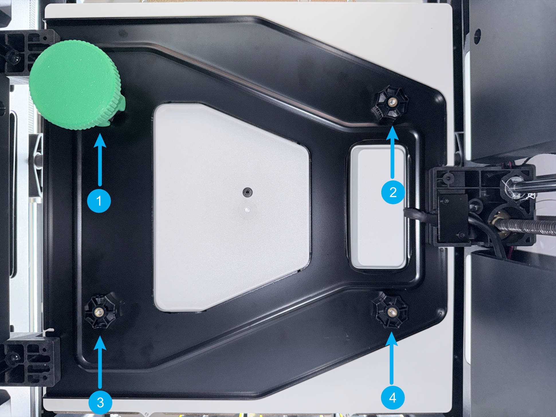 (2) Remove the four nuts at the bottom of the heated bed. You can use the printed auxiliary tool if need.