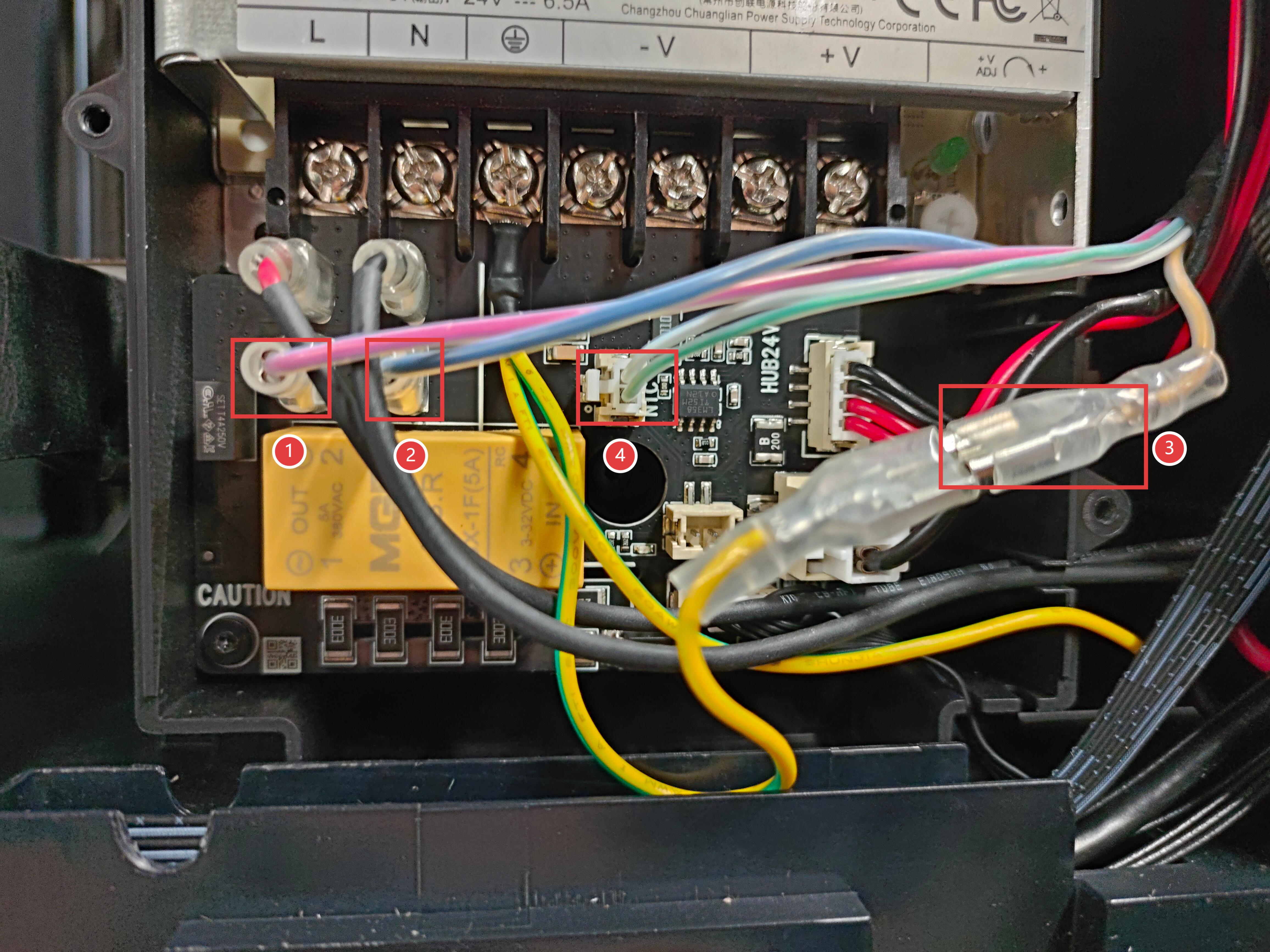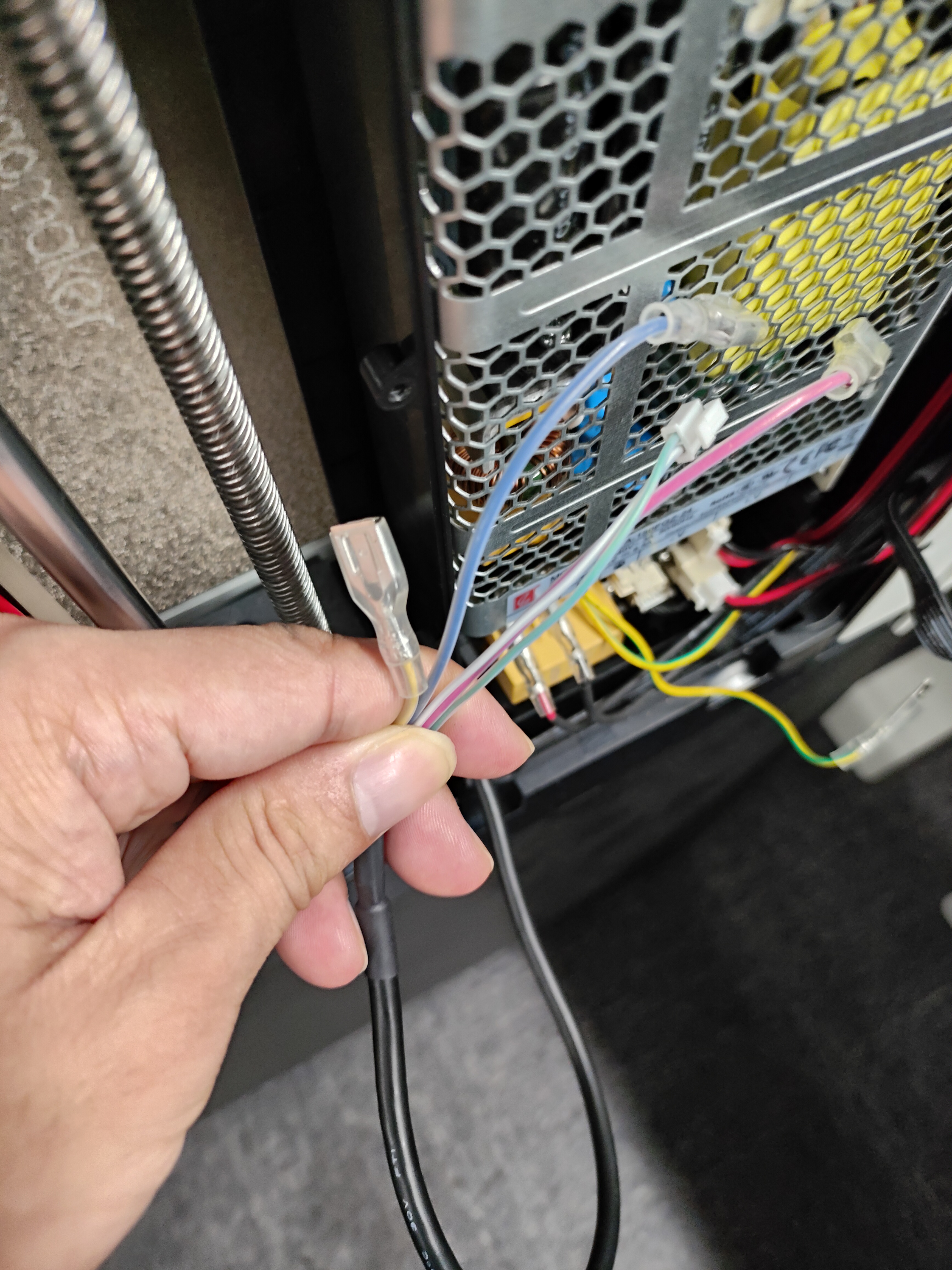 - Pull the heated bed cables out from the back of the power supply box as shown in the image.