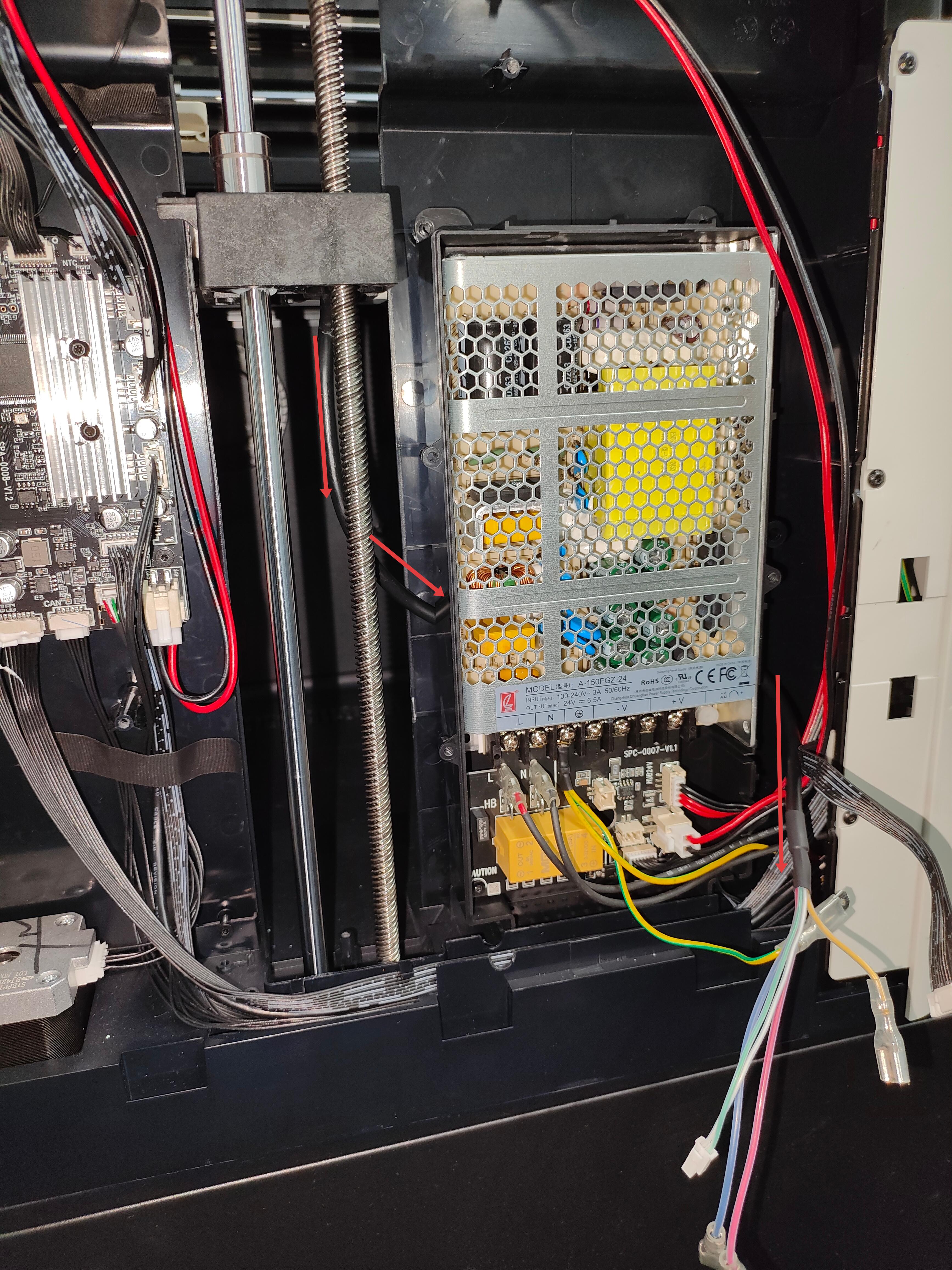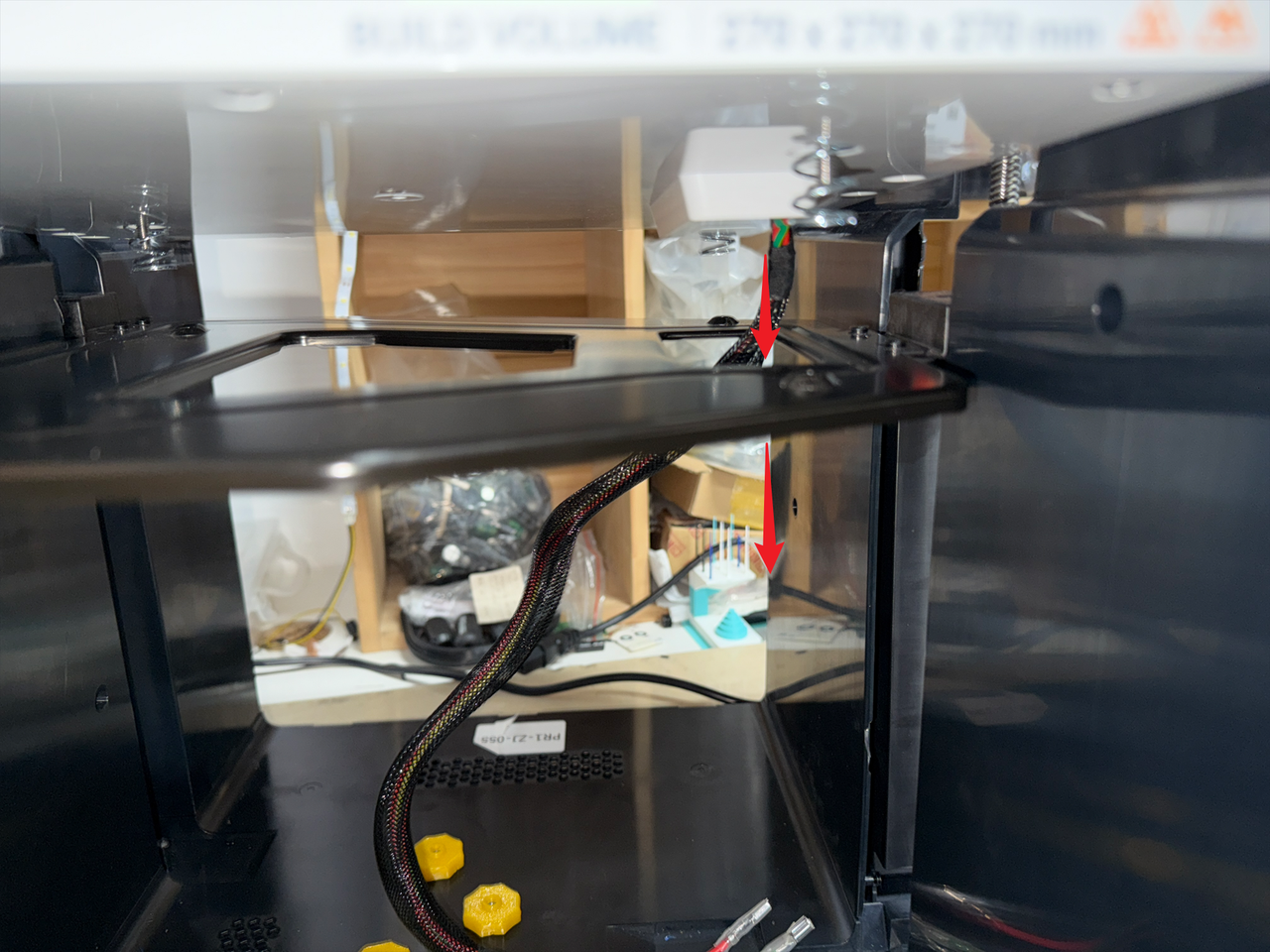 - Thread the new heated bed cables through the metal plate and right inner panel, around the back of the power supply box to the connection area.