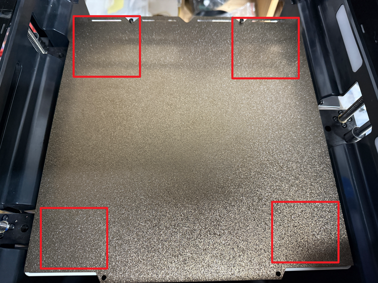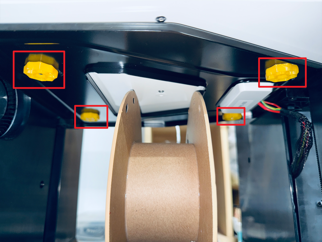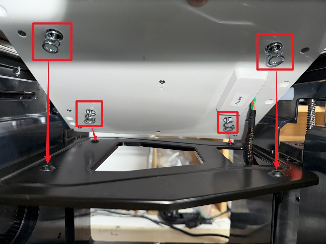- Place the spool holder (or an equivalent support) under the heated bed as shown. Press down on the platform so that the sheet metal beneath the bed is firmly in contact with the support. First, loosely fasten the four nuts underneath the sheet metal in sequence, then fully tighten them. While pre-tightening or tightening the nuts, make sure to press down on the platform directly above each nut.