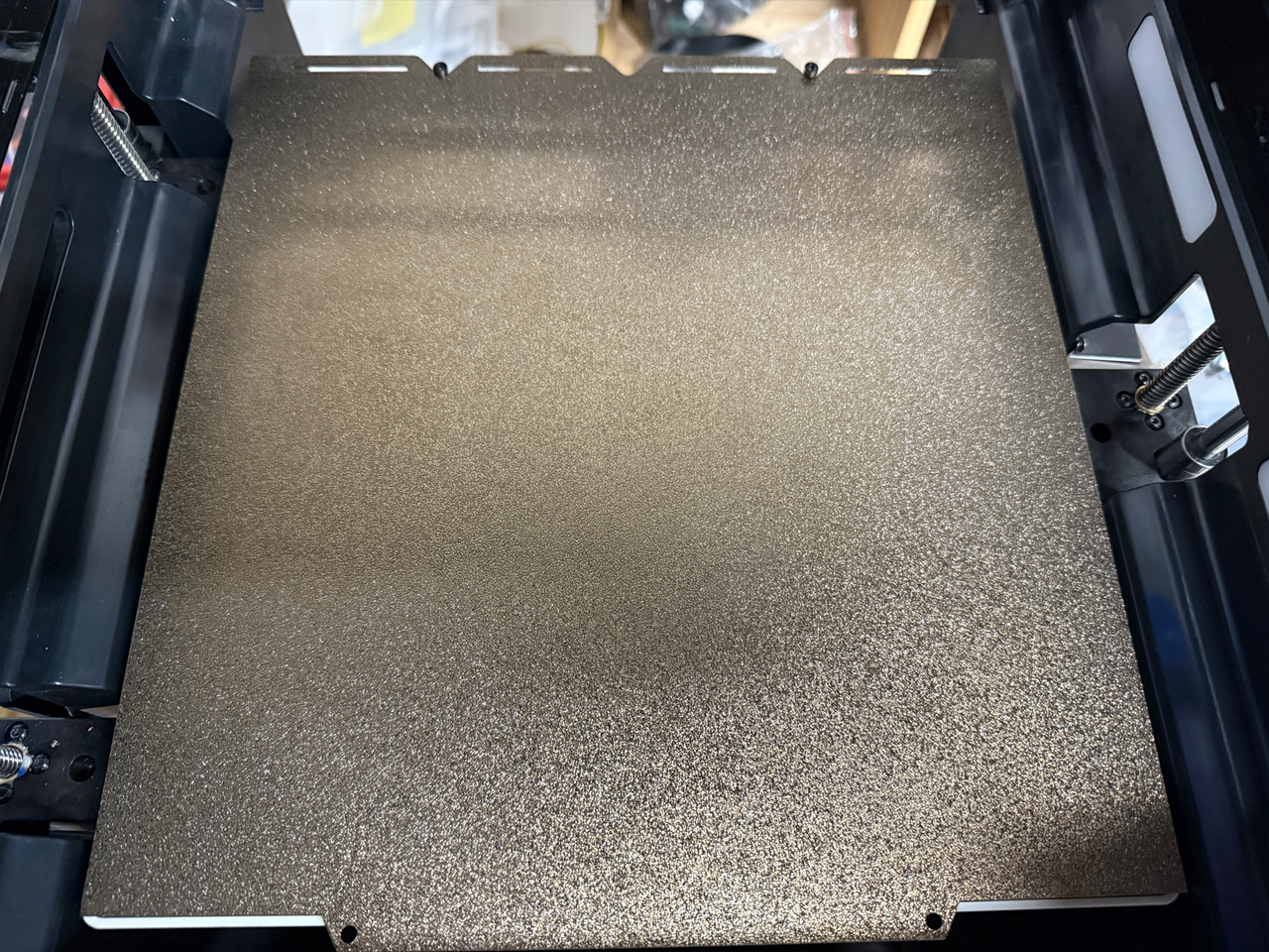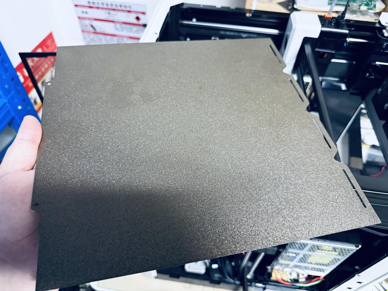 The heated bed is located inside the machine chamber, and its cable runs through the right inner panel to connect to the main power supply. To replace it, please remove the right plastic panel first.