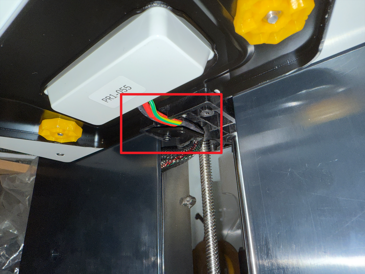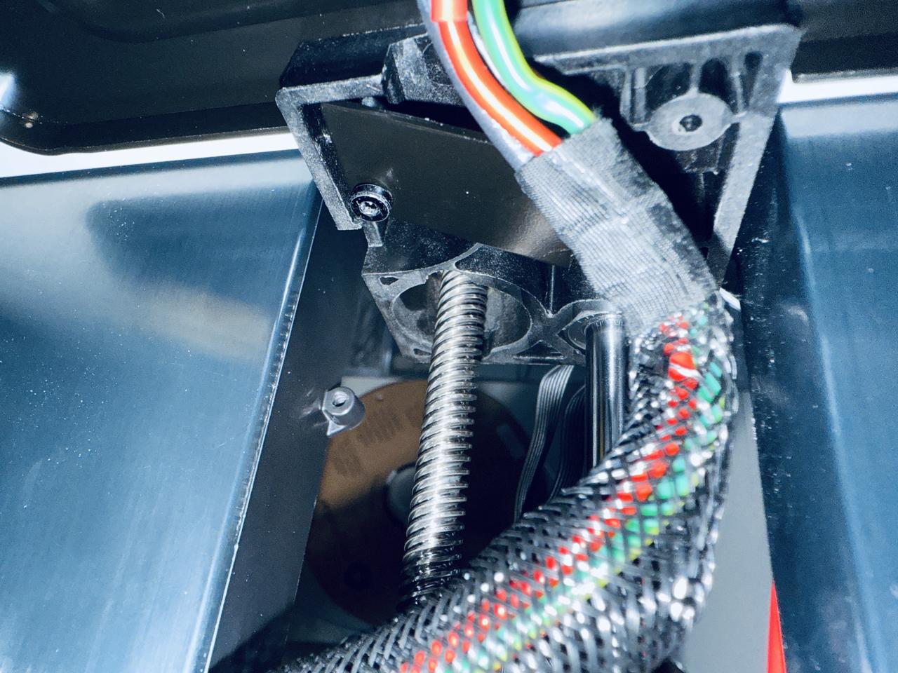 - Remove the spool holder (or equivalent support) from beneath the sheet metal. Route the heated bed cables over the cable clamp, then use the H2.0 hex key to tighten the outer screw of the clamp.