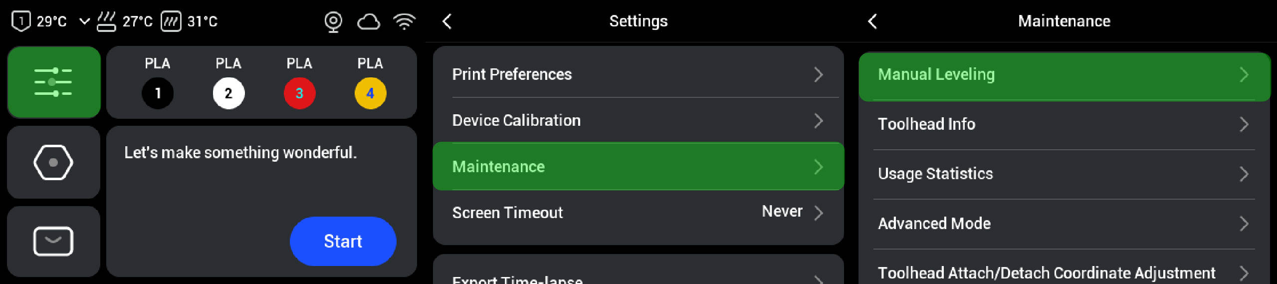 After replacing the heated bed, you must perform manual bed leveling to prevent excessive bed tilt that could cause the nozzle to scrape against the heated bed.