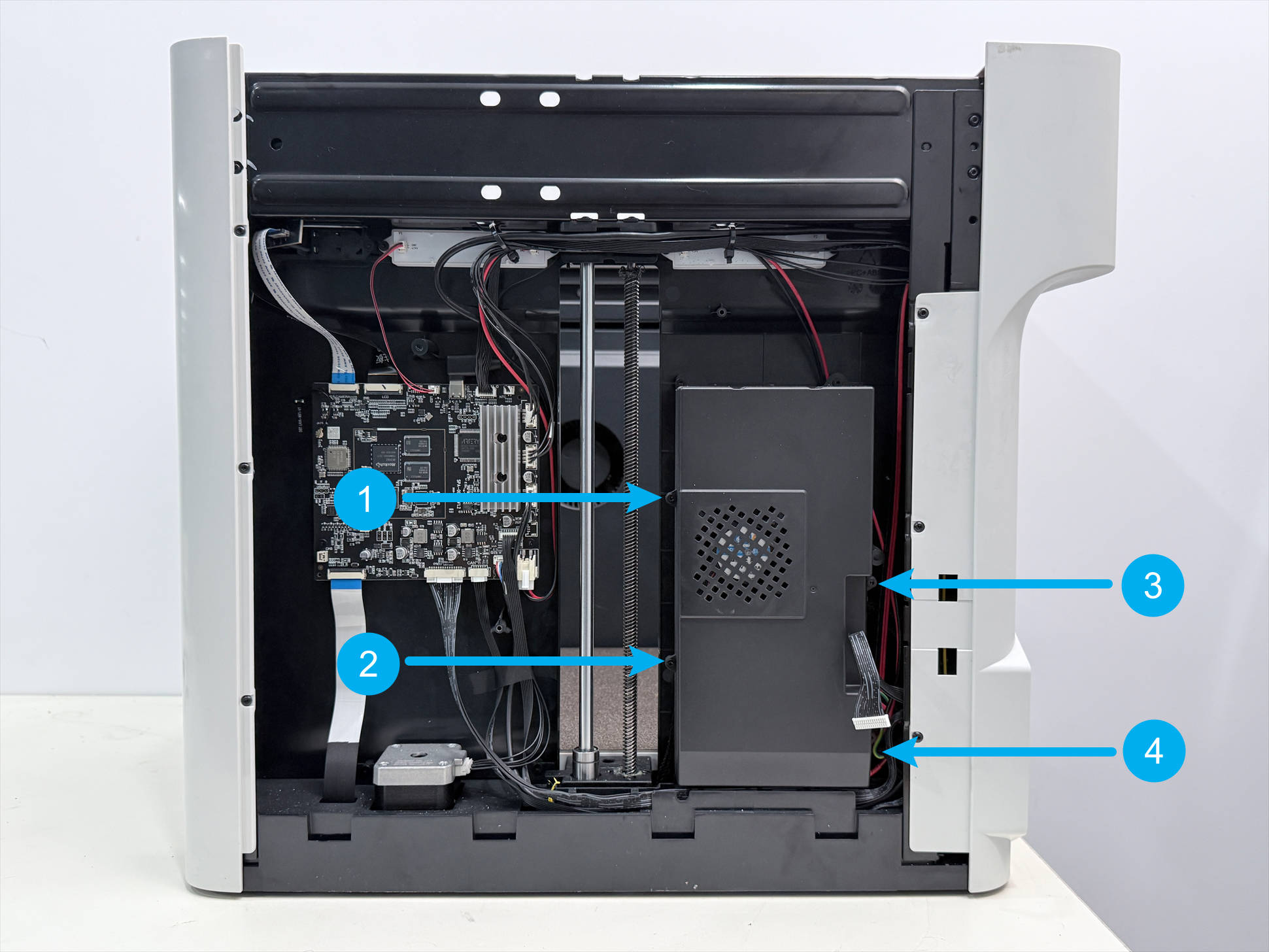 (7) Use an H2.0 hex key to remove the four screws shown in the image to create some clearance behind the power supply. Then route the heated bed cable through the back of the power supply and remove the heated bed.