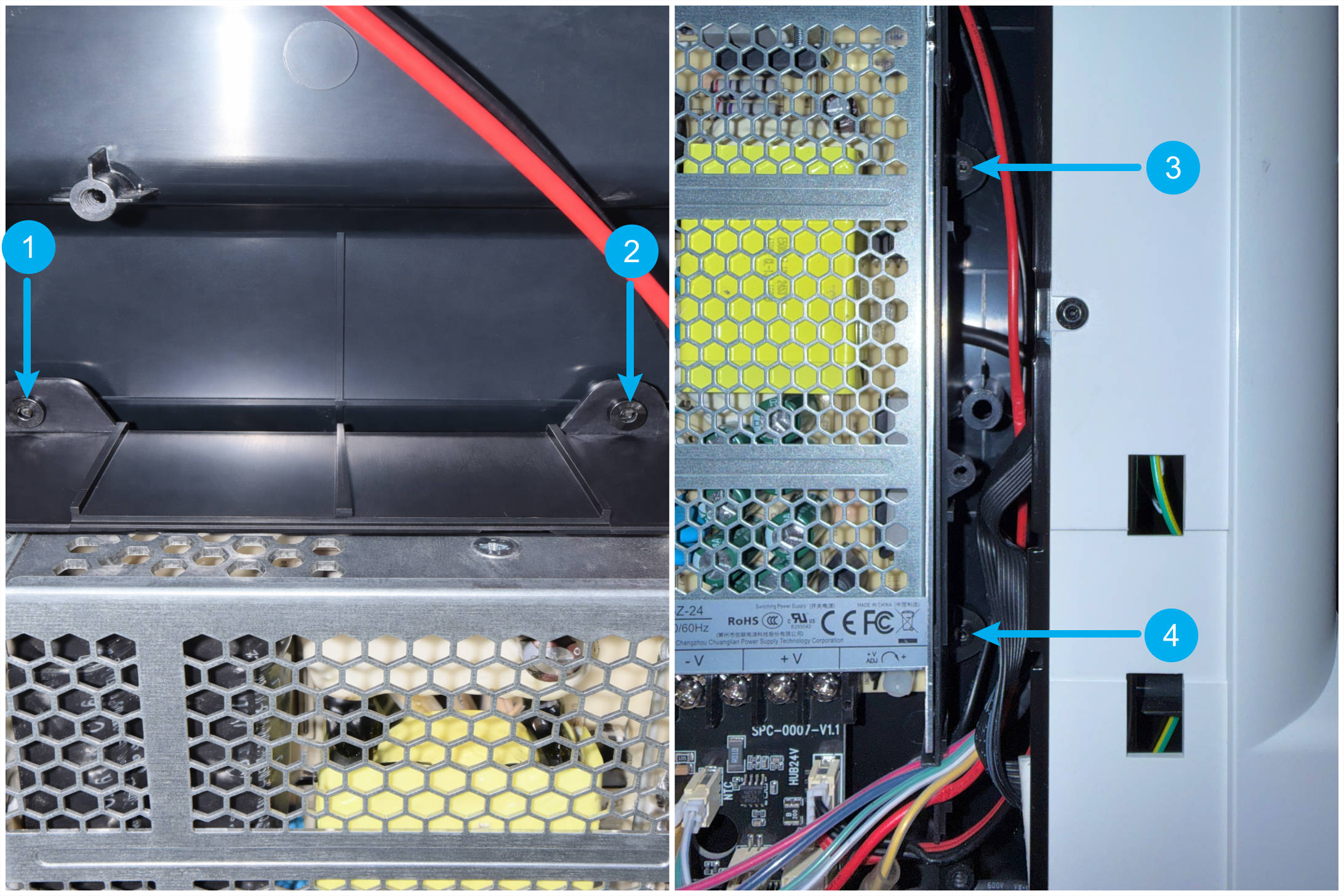 (1) Power off and unplug the machine, then use an H2.0 hex key to tighten the power supply mounting screws.
