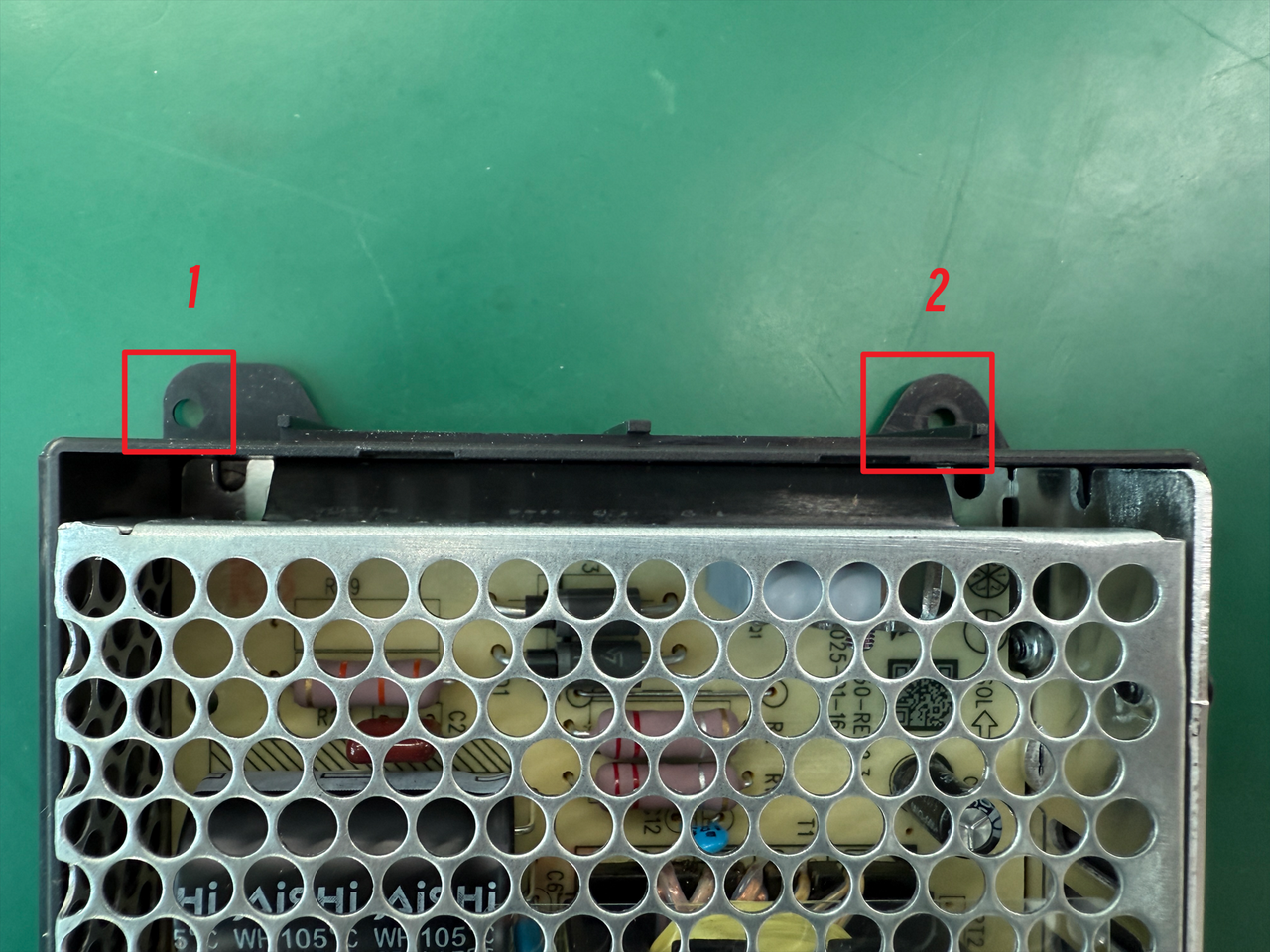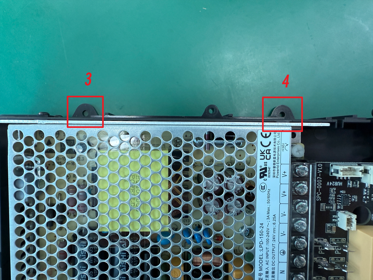 - Remove screws 3 and 4 from the right side of the power supply box.