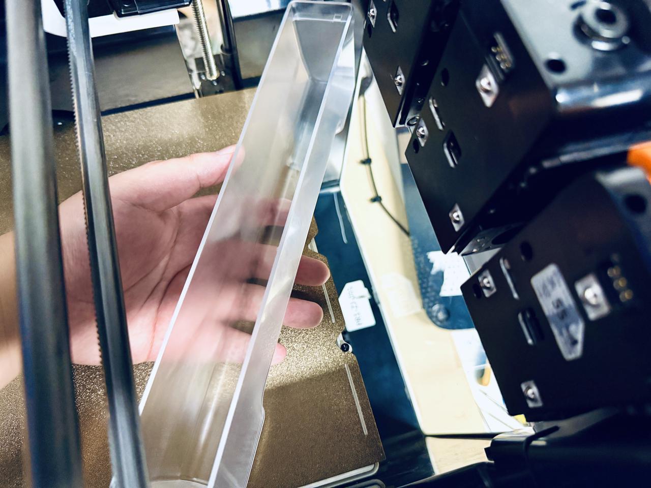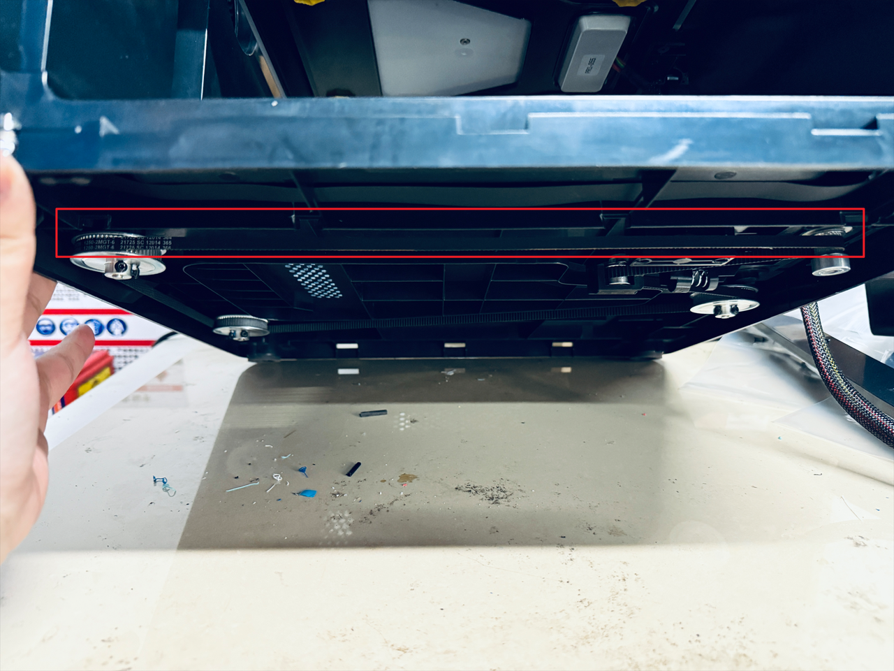 - Facing the front panel of the machine, lift the machine slightly. Pull the timing belt to the left to raise the Z-axis, or to the right to lower it. Adjust the heated bed to a suitable position, then remove the waste collector.