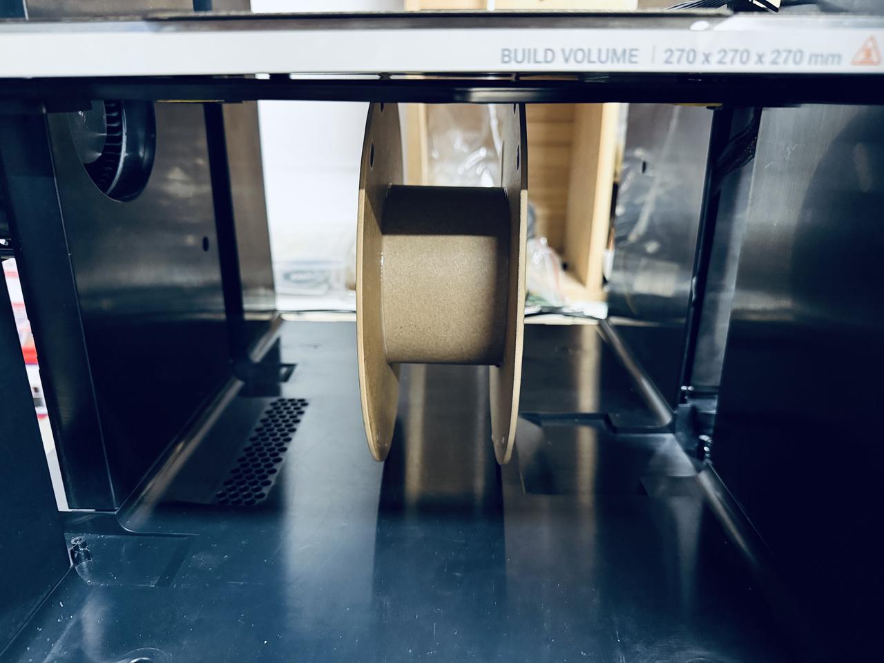 - Place the filament spool (or an equivalent support) directly under the heated bed as shown. Press down on the platform so the sheet metal beneath the bed rests firmly against the support. Then, unscrew the four nuts under the sheet metal one by one. While loosening each nut, make sure to press down on the platform directly above it.