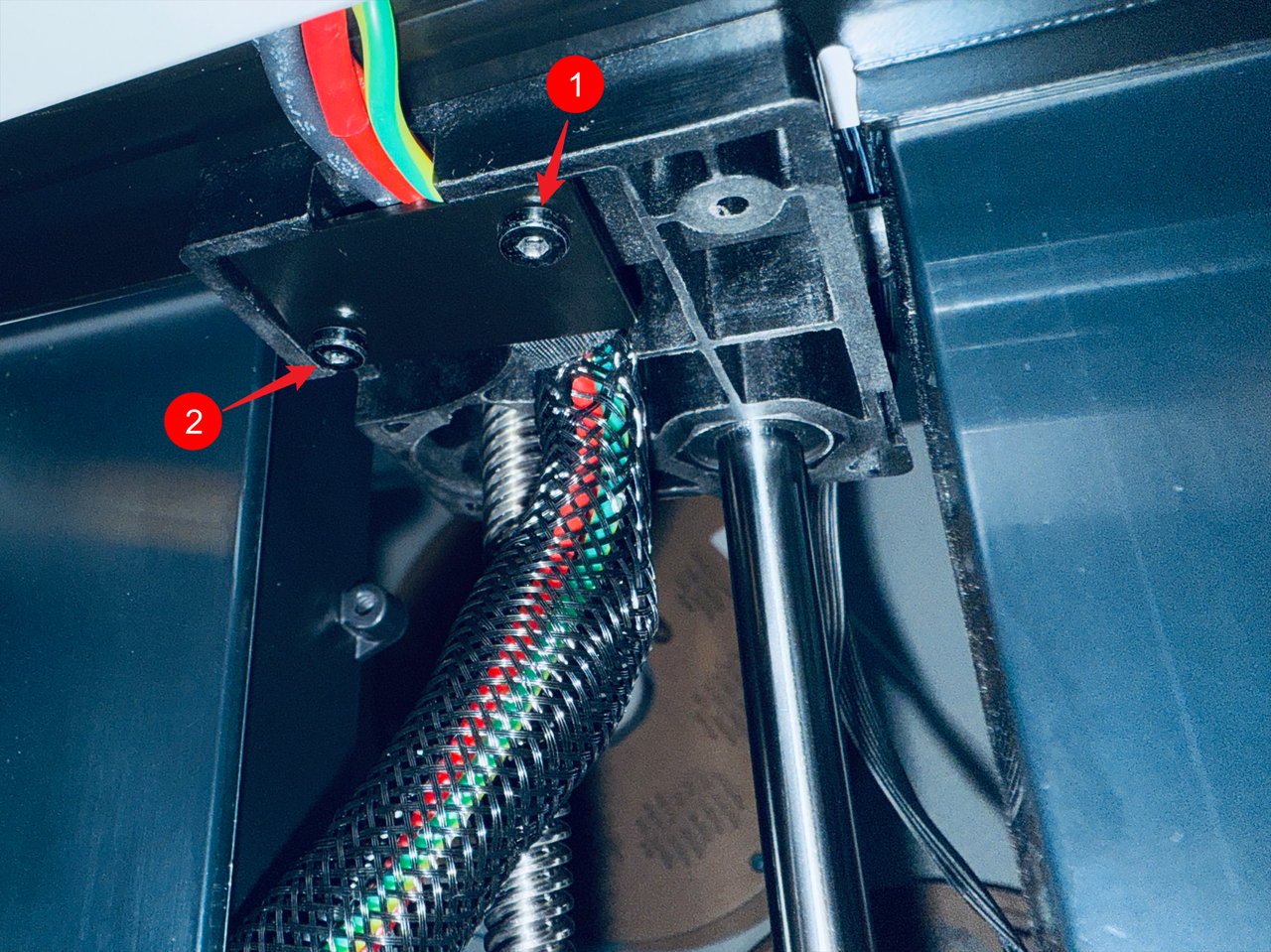 - Use the H2.0 hex key to remove the screw at position 1 in the image. Then, loosen the screw at position 2 just enough so the cable clip can move freely. Finally, slide the heated bed cables out of the clip.