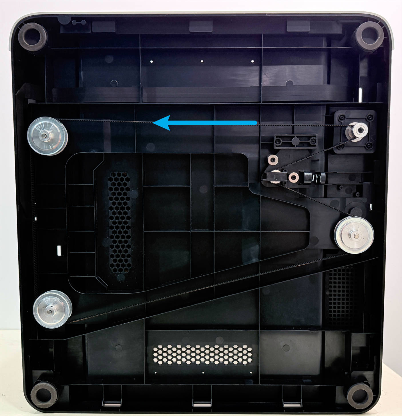 (1) At the bottom of the machine, locate the timing belt. Pull it leftward to raise the heated bed.