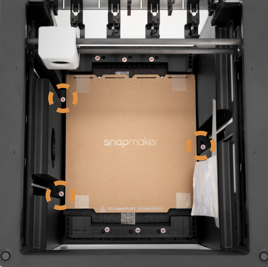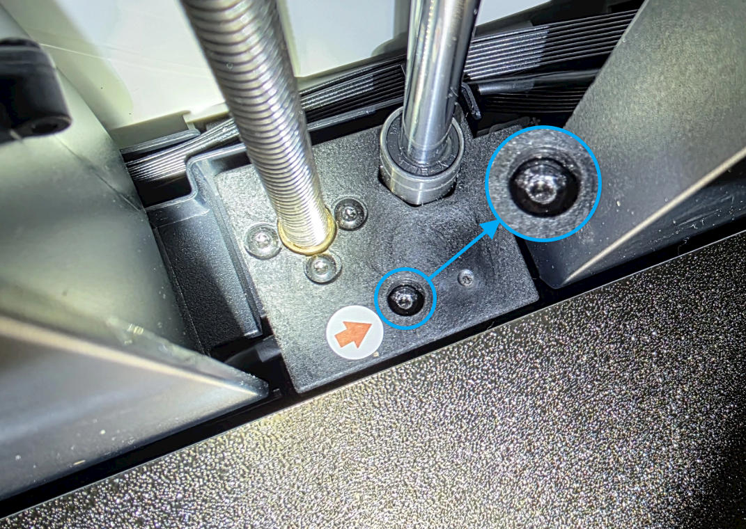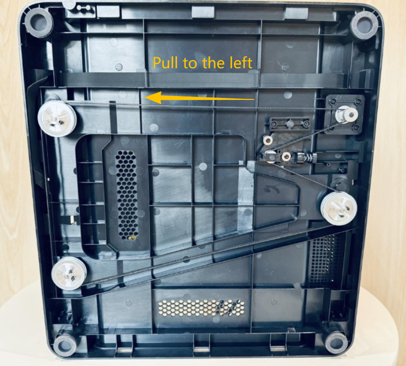 To prevent shifting during transport, the U1 heated bed is secured with three screws (as shown below). First, use an H2.0 hex key to remove the other screws, which will release the tension between the timing belt and the heated bed.