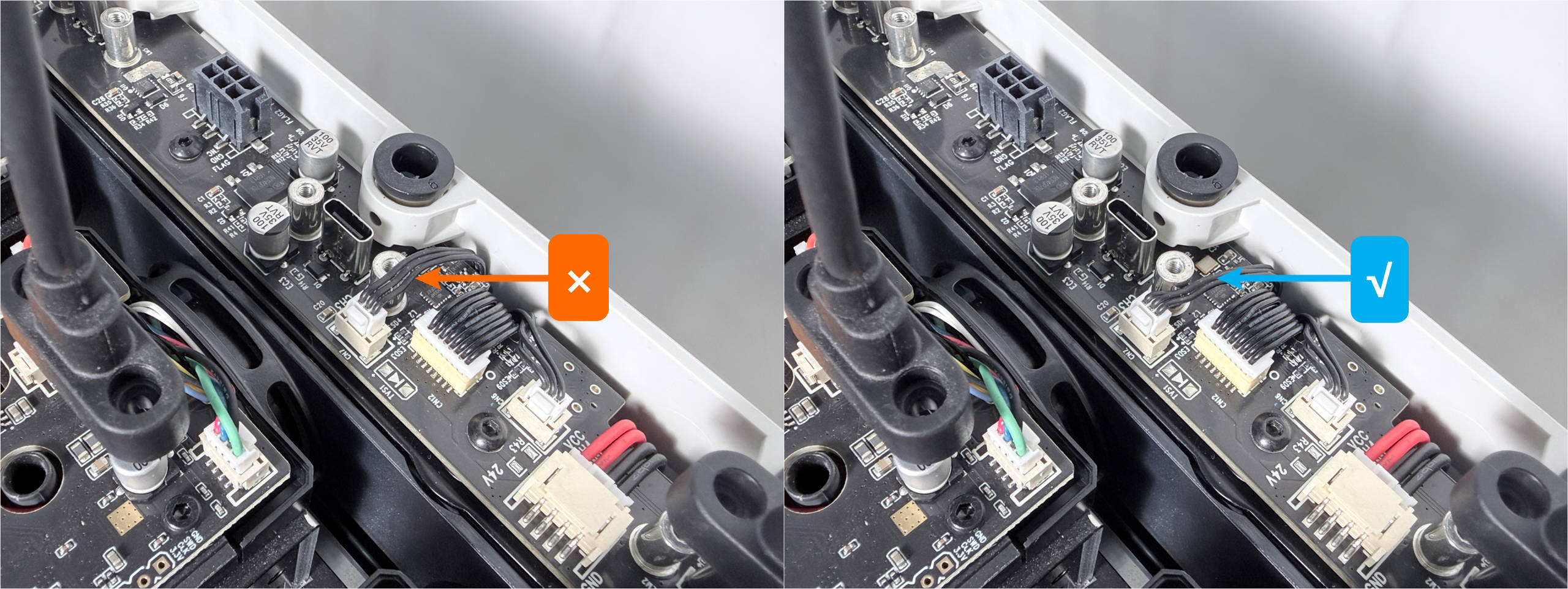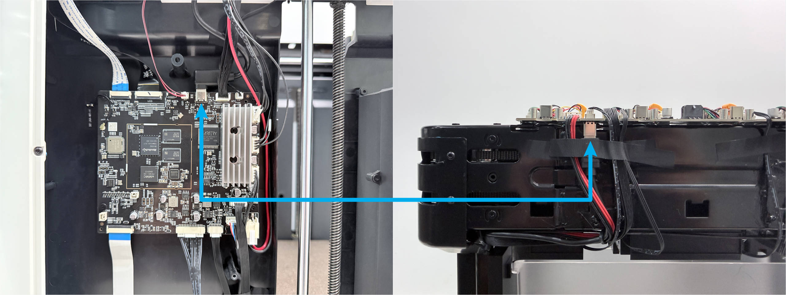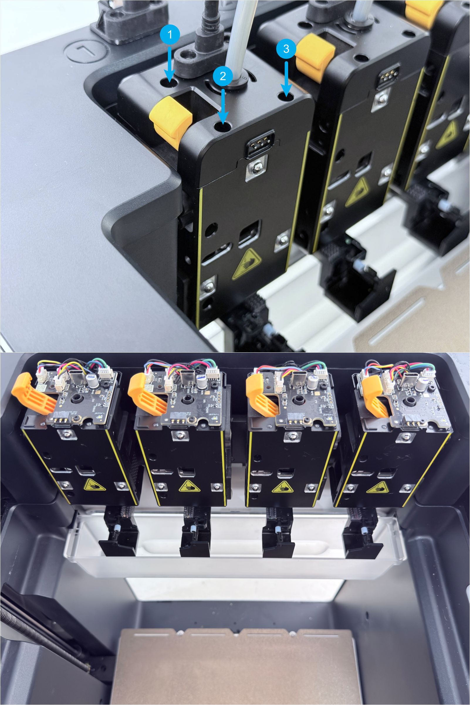 Keep the top panel and right side panel of the machine uninstalled. Reconnect the toolhead USB cables and power on the machine.