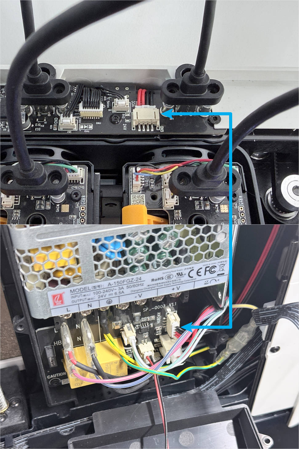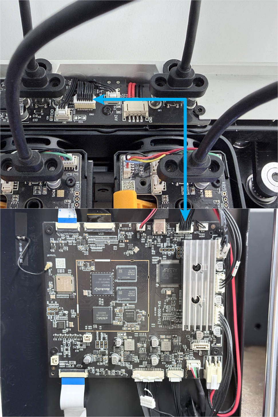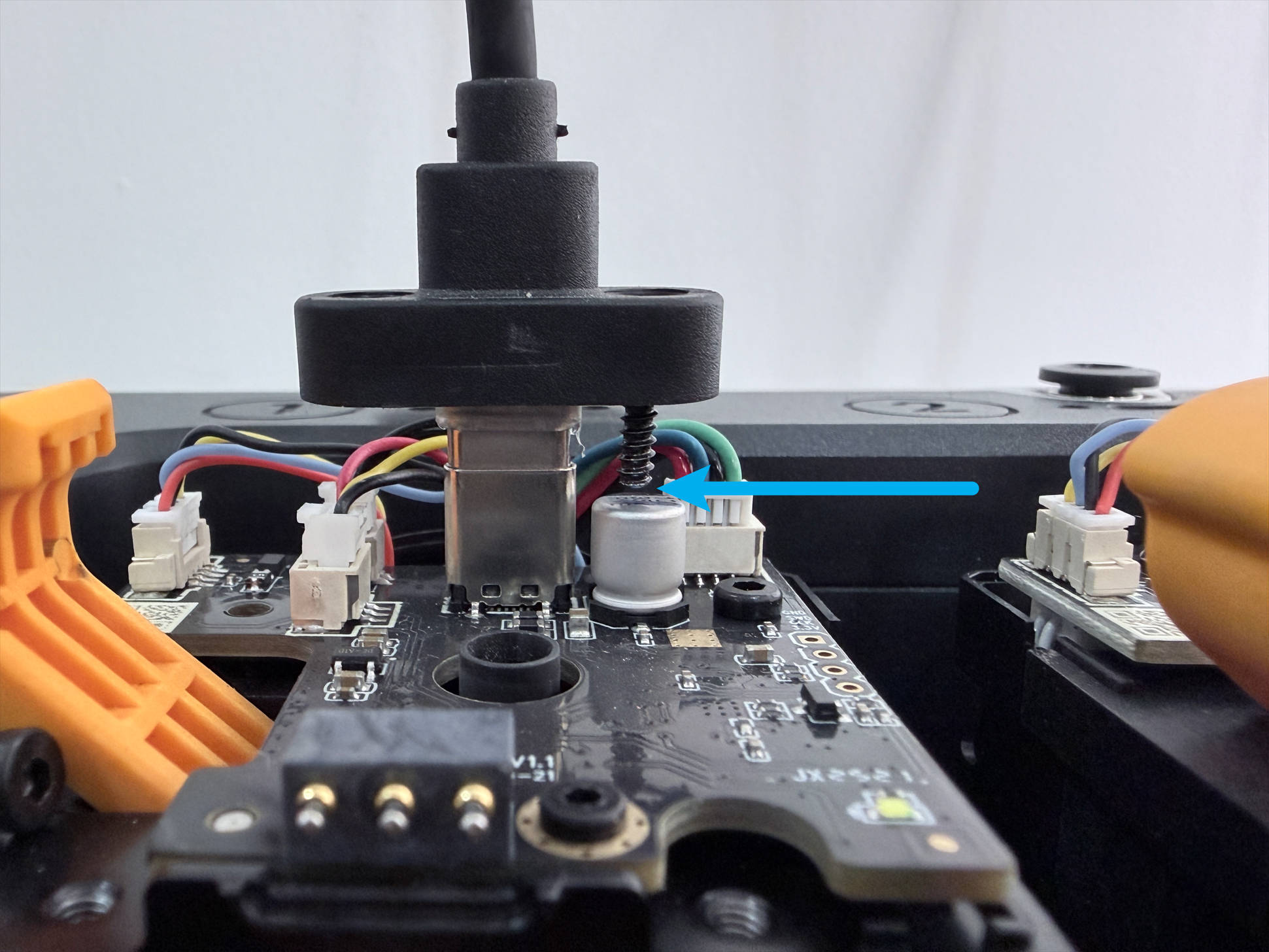 Keep the top panel and right side panel of the machine uninstalled. Reconnect the toolhead USB cables and power on the machine.