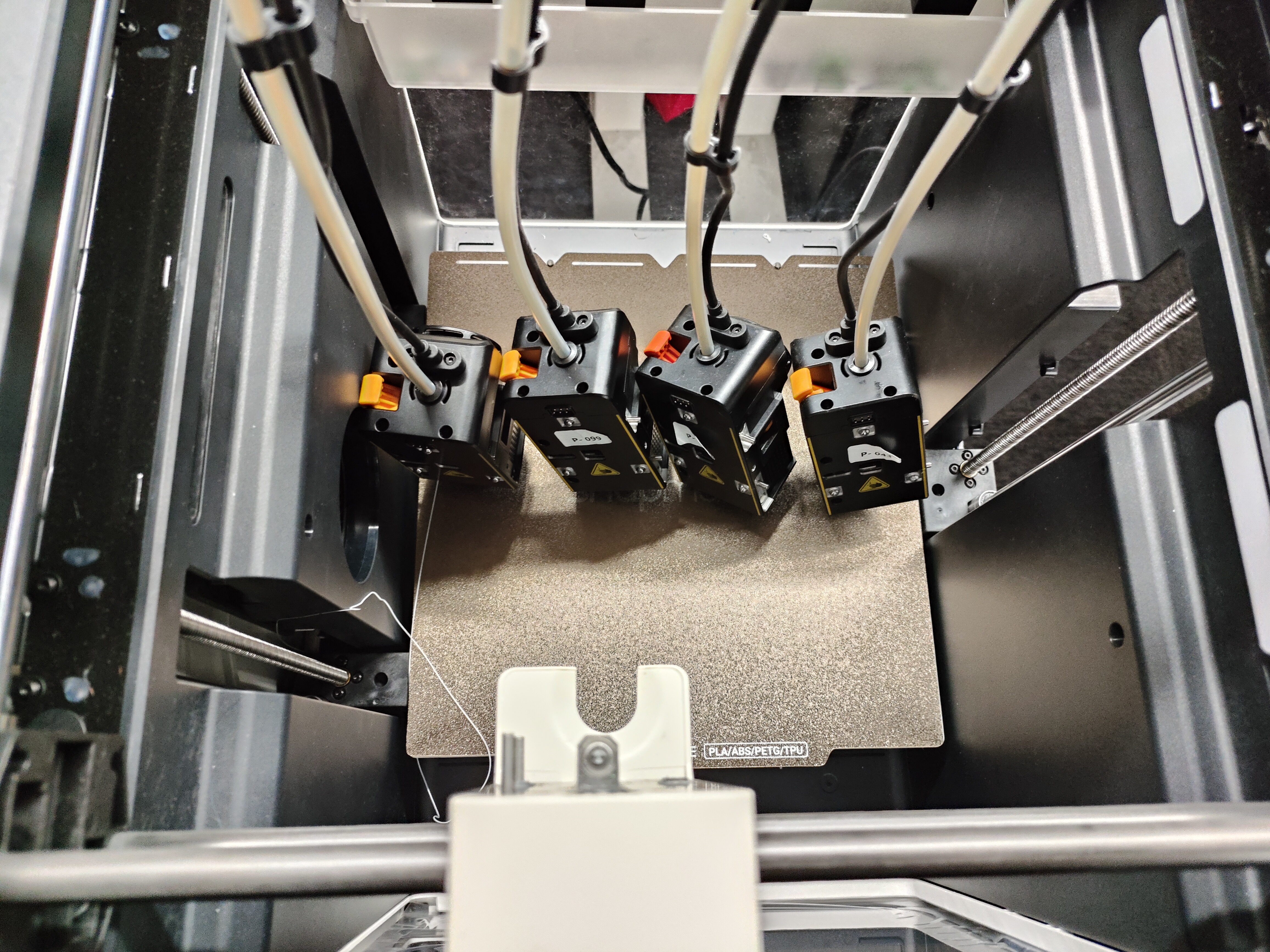 Detach the 4 toolheads from the docking bracket, and place them on the print platform.