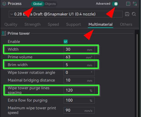 When adhesion between different materials is poor (e.g., PLA + PETG), the entire tower is prone to layer separation (delamination) or breakage at the material interface. You can specify the filament used for the wipe tower shell.