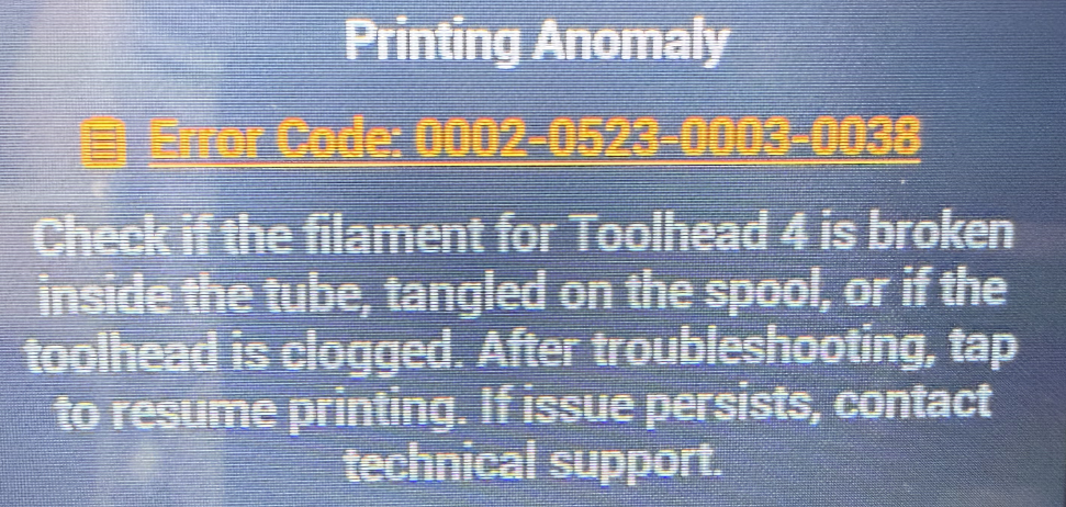The print stops midway and an error appears on the screen. Clicking “Continue” allows the print to resume temporarily.