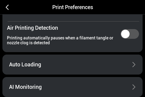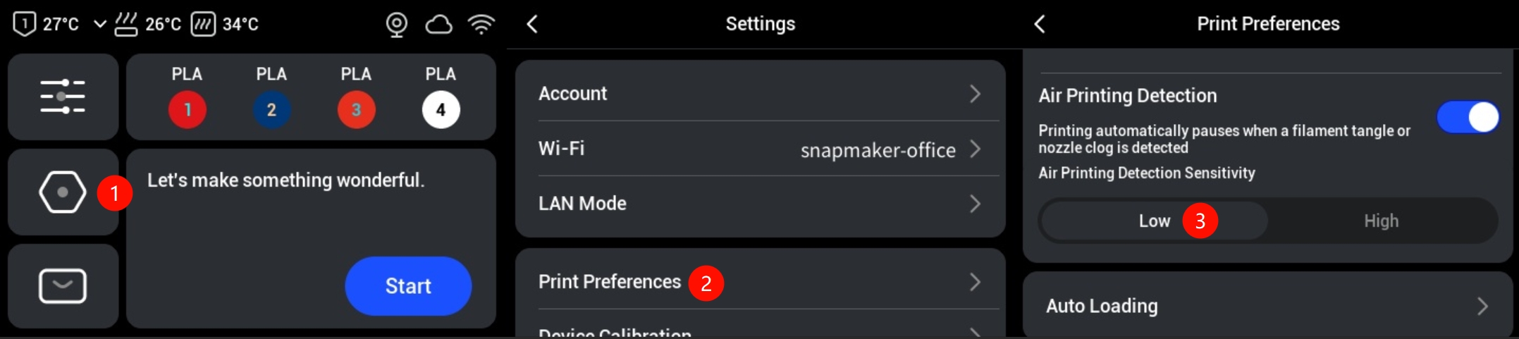 - On the touchscreen, go to print preferences and set the Air Printing Detection sensitivity to Low.