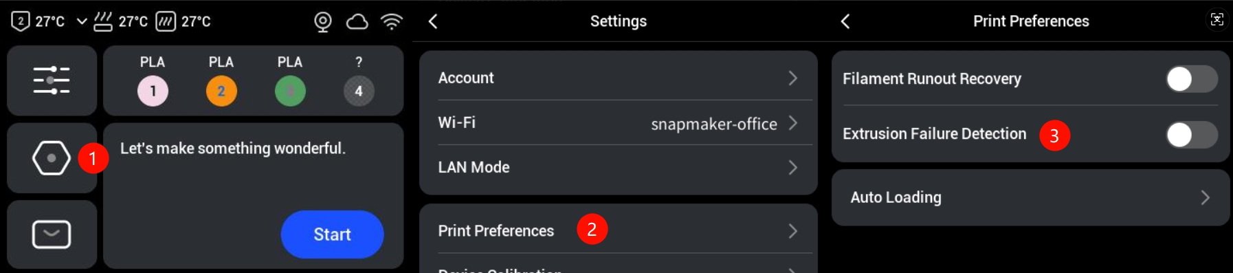 Before starting a print, disable the “Extrusion Failure Detection” function in Settings > Print Preferences.