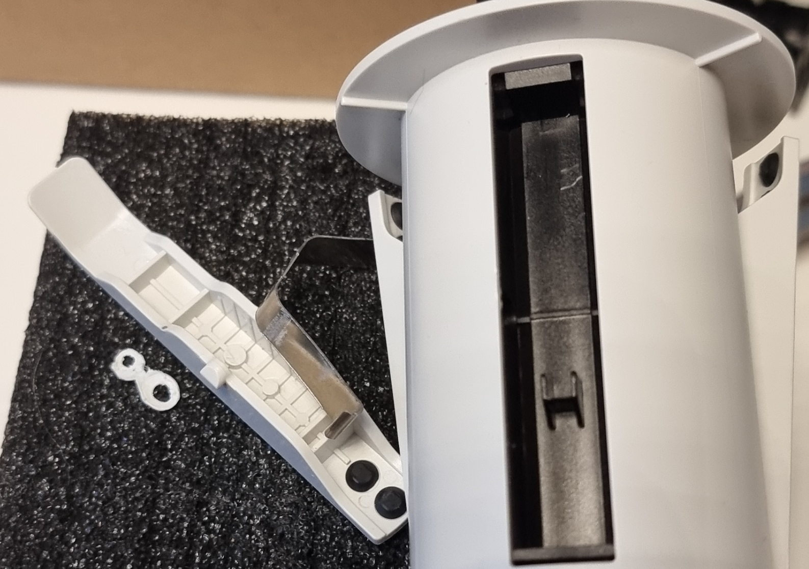 The spool claw assembly has fully detached, but the internal spring clip remains securely installed inside the filament holder. In this case, the spool claw can be reset manually.