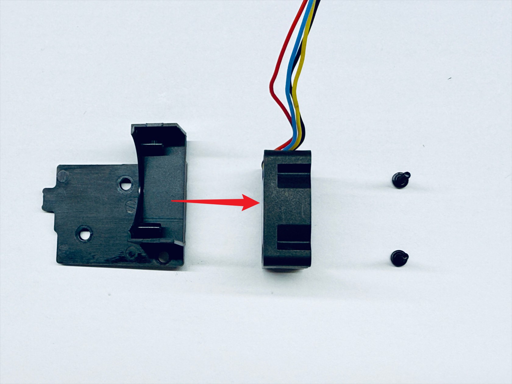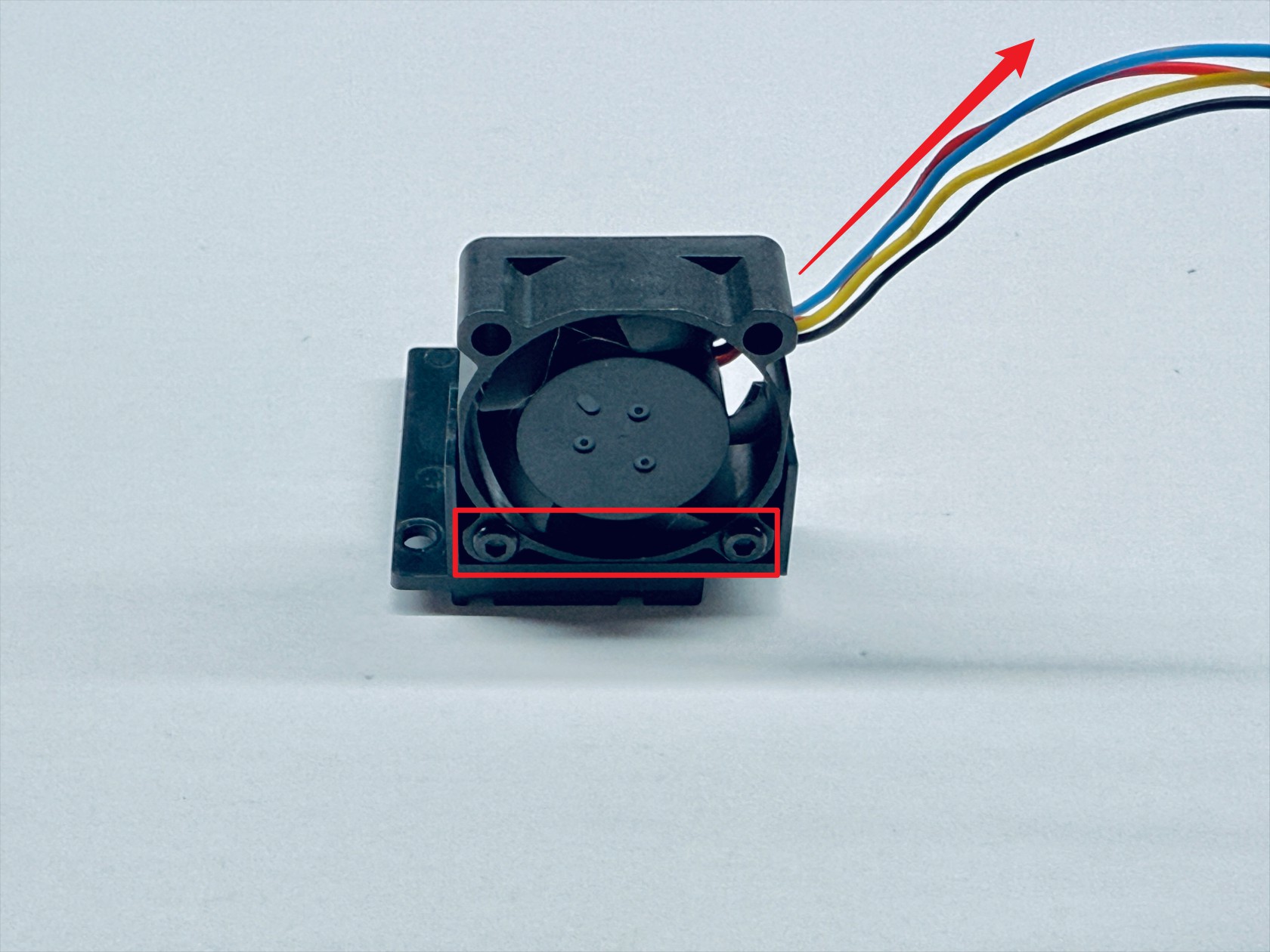 Install the hotend cooling fan onto the fan base in the orientation shown (pay attention to the fan cable direction), and use an H1.5 hex key to tighten the 2 fixing screws
