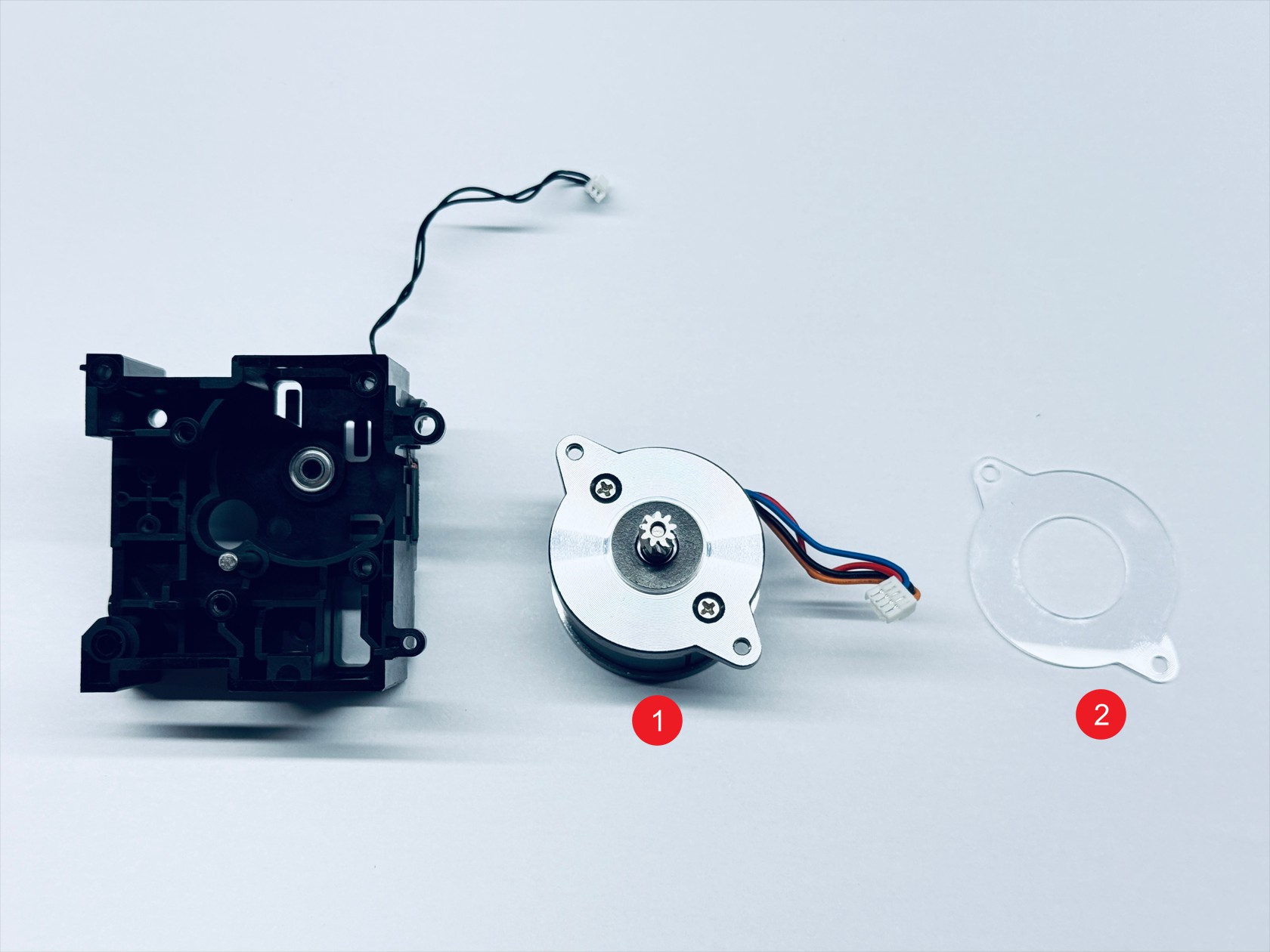 Use an H2.0 hex key to unscrew the 2 fixing screws and remove the extruder motor—1 and the motor heat shield—2