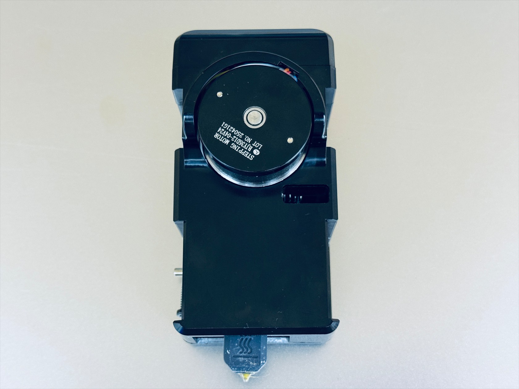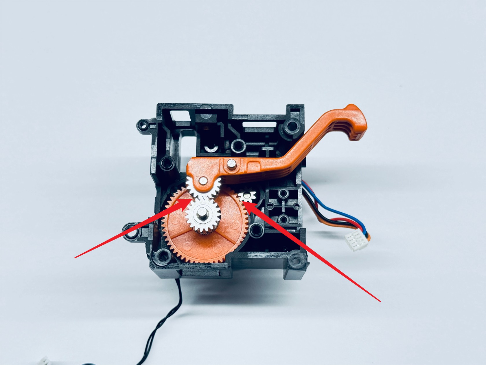 Install the driving extruder assembly and the driven extruder assembly sequentially, ensuring that the 3 gears shown mesh correctly. Rotate the active extruder gear to confirm that the other two gears turn smoothly, indicating proper installation