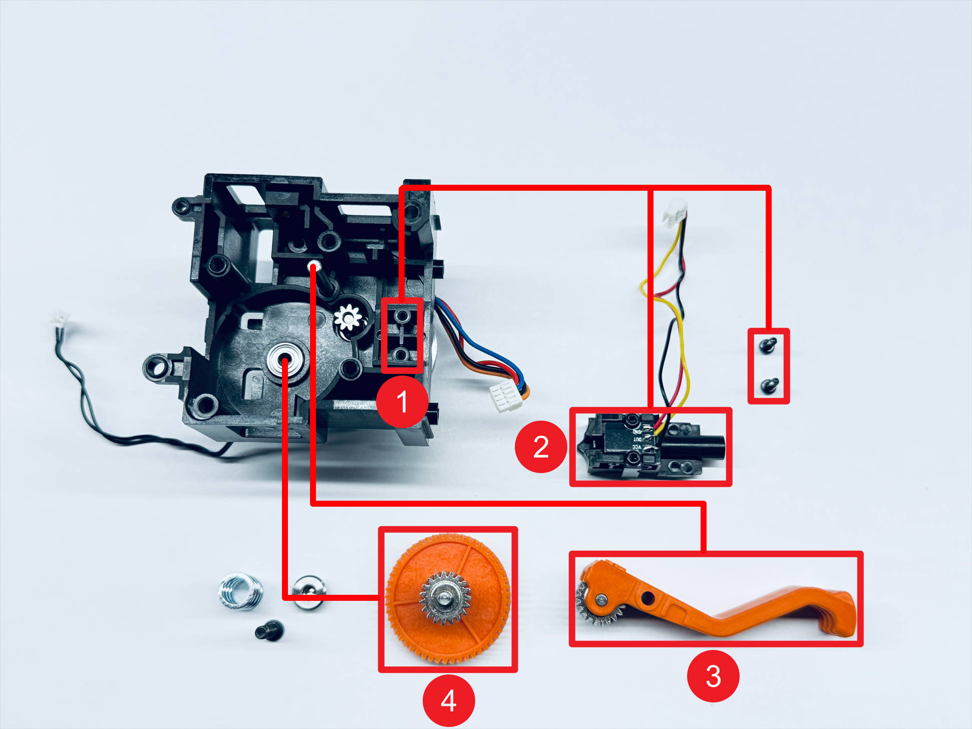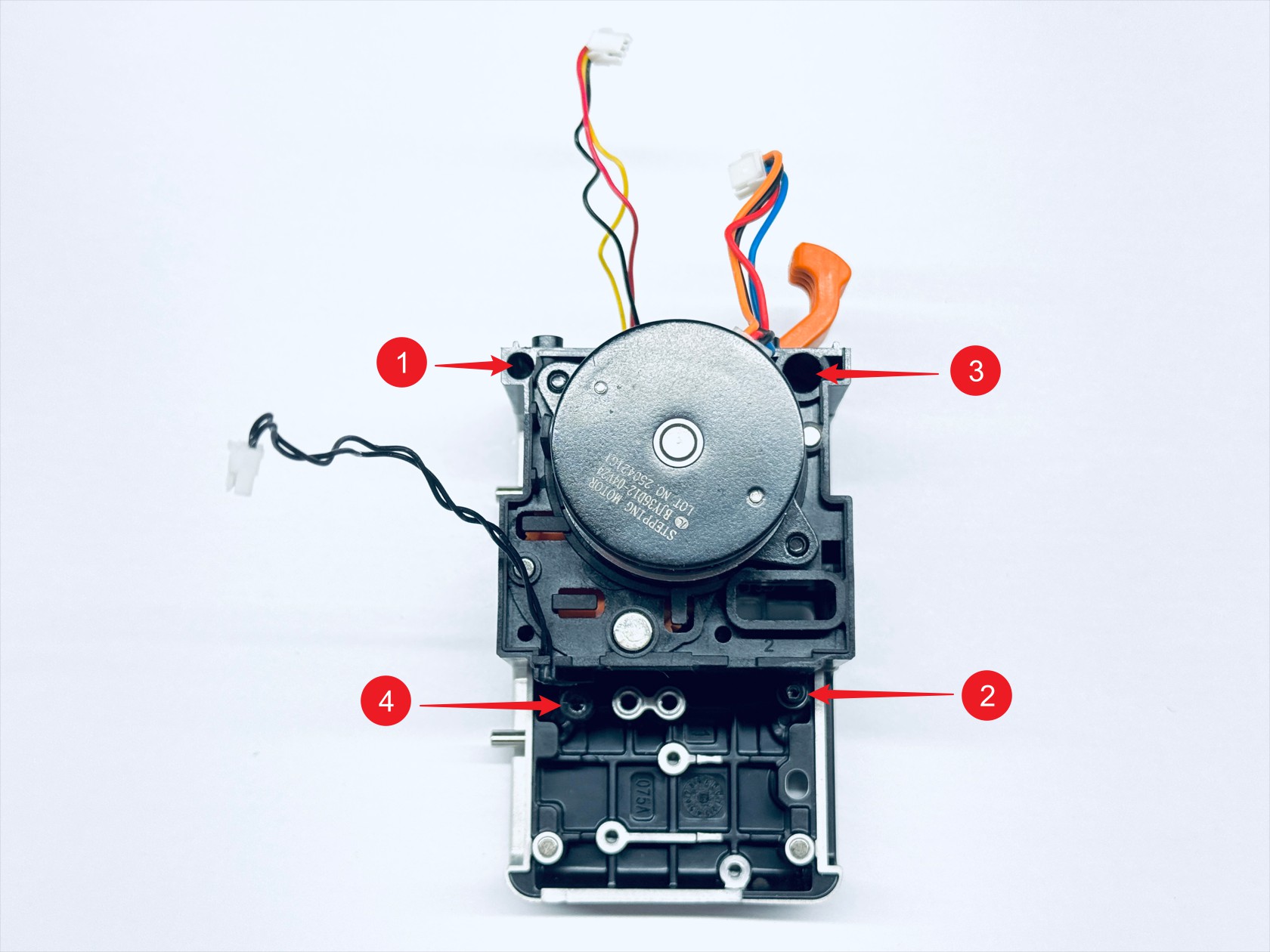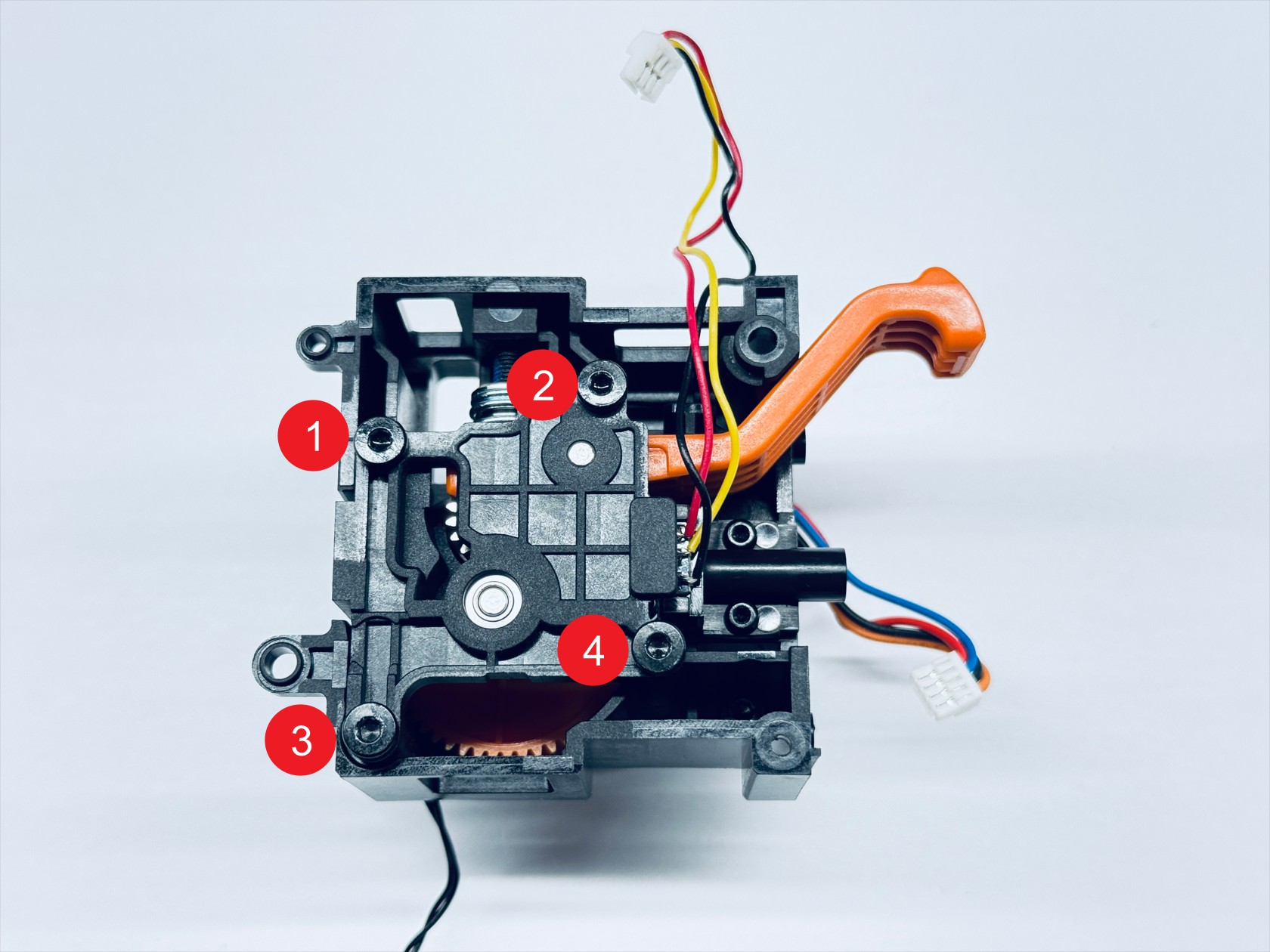 Mount the assembled extruder unit back onto the toolhead male mount in the orientation shown, and use H1.5 and H2.0 hex keys to tighten fixing screws 1, 2, 3, and 4 respectively