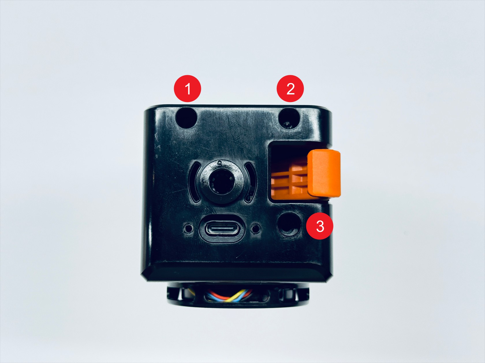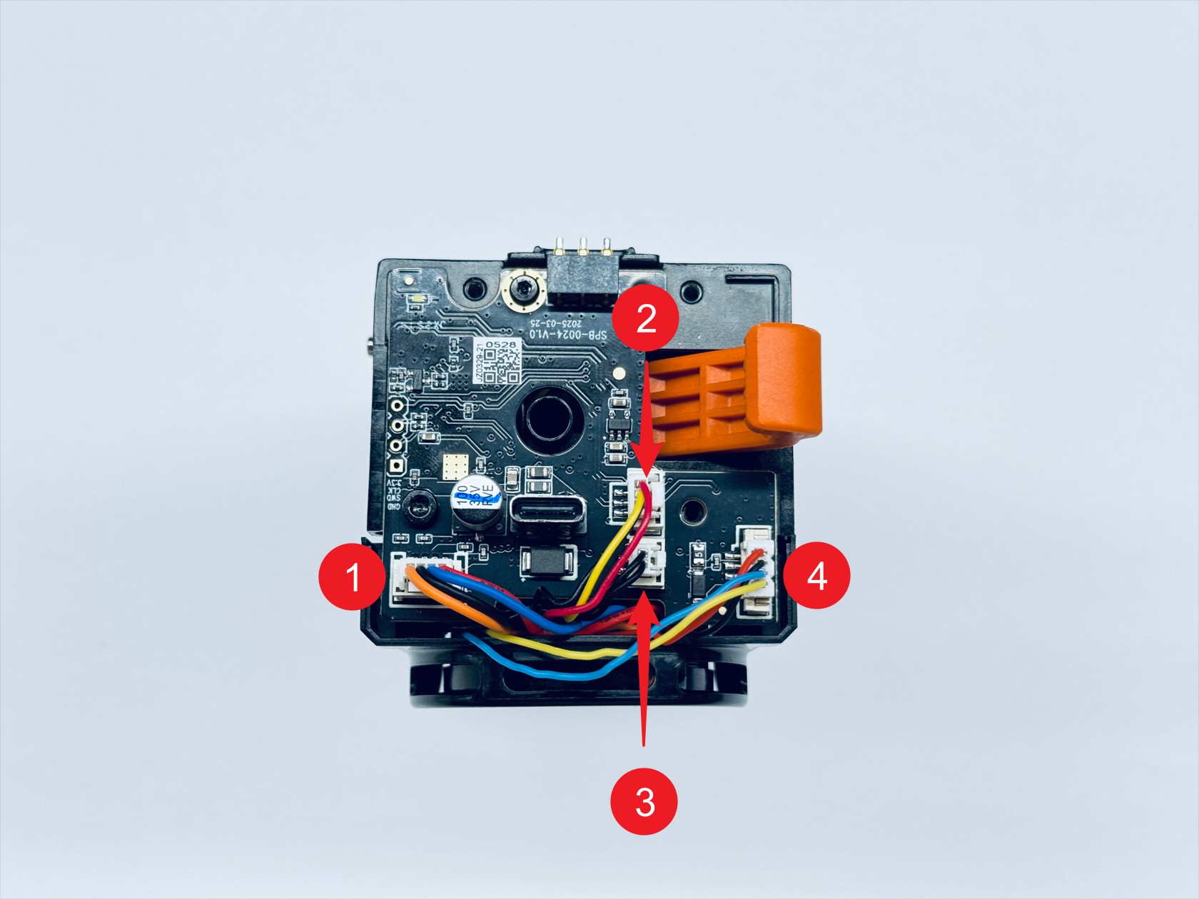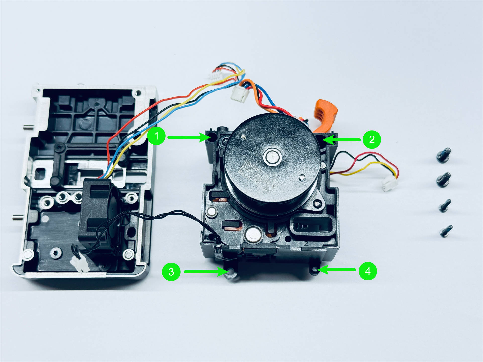Mount the assembled extruder unit back onto the toolhead male mount in the orientation shown, and use H1.5 and H2.0 hex keys to tighten fixing screws 1, 2, 3, and 4 respectively